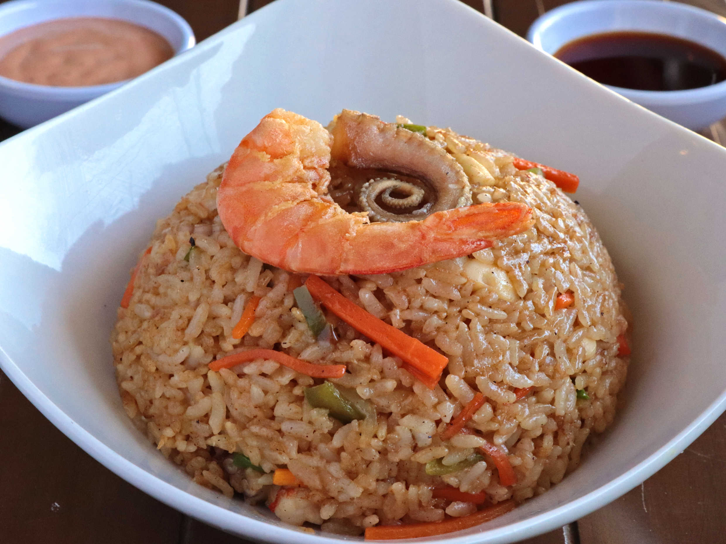 Arroz frito con pulpo, camarón, zanahoria, apio y morrón mezclado con salsa de soya preparada.