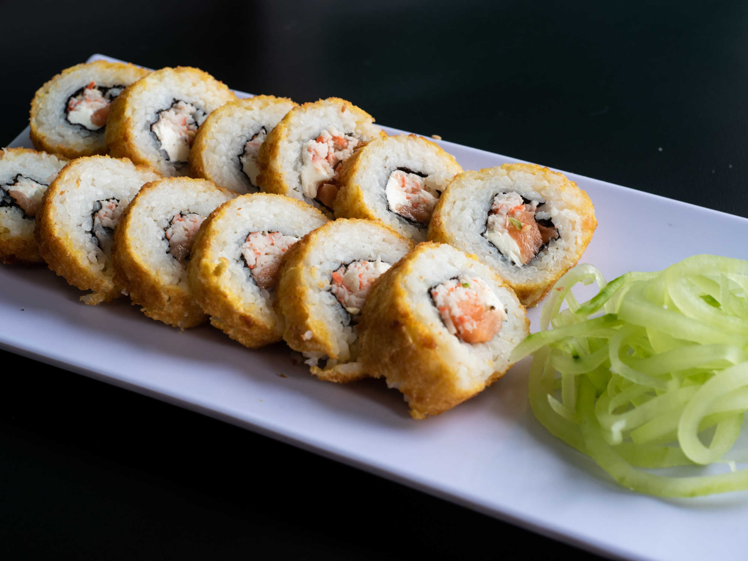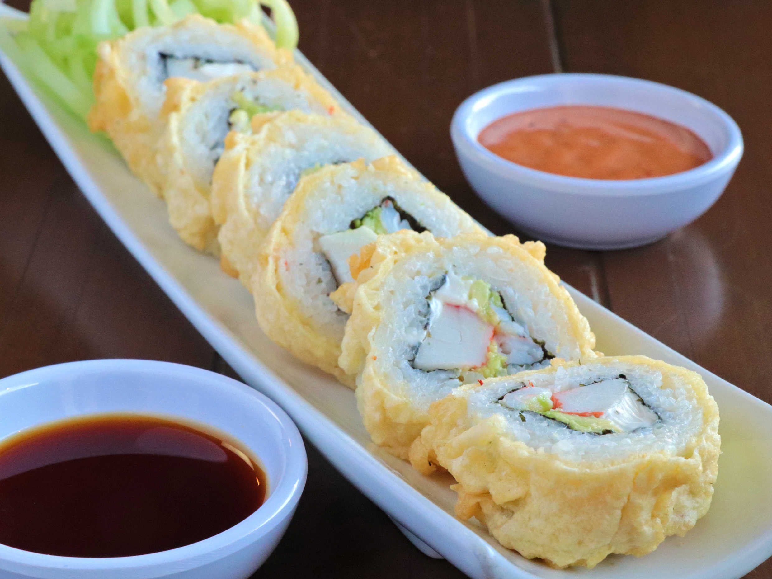 Por dentro philadelphia, aguacate y camarón. Por fuera pasta tampico.
