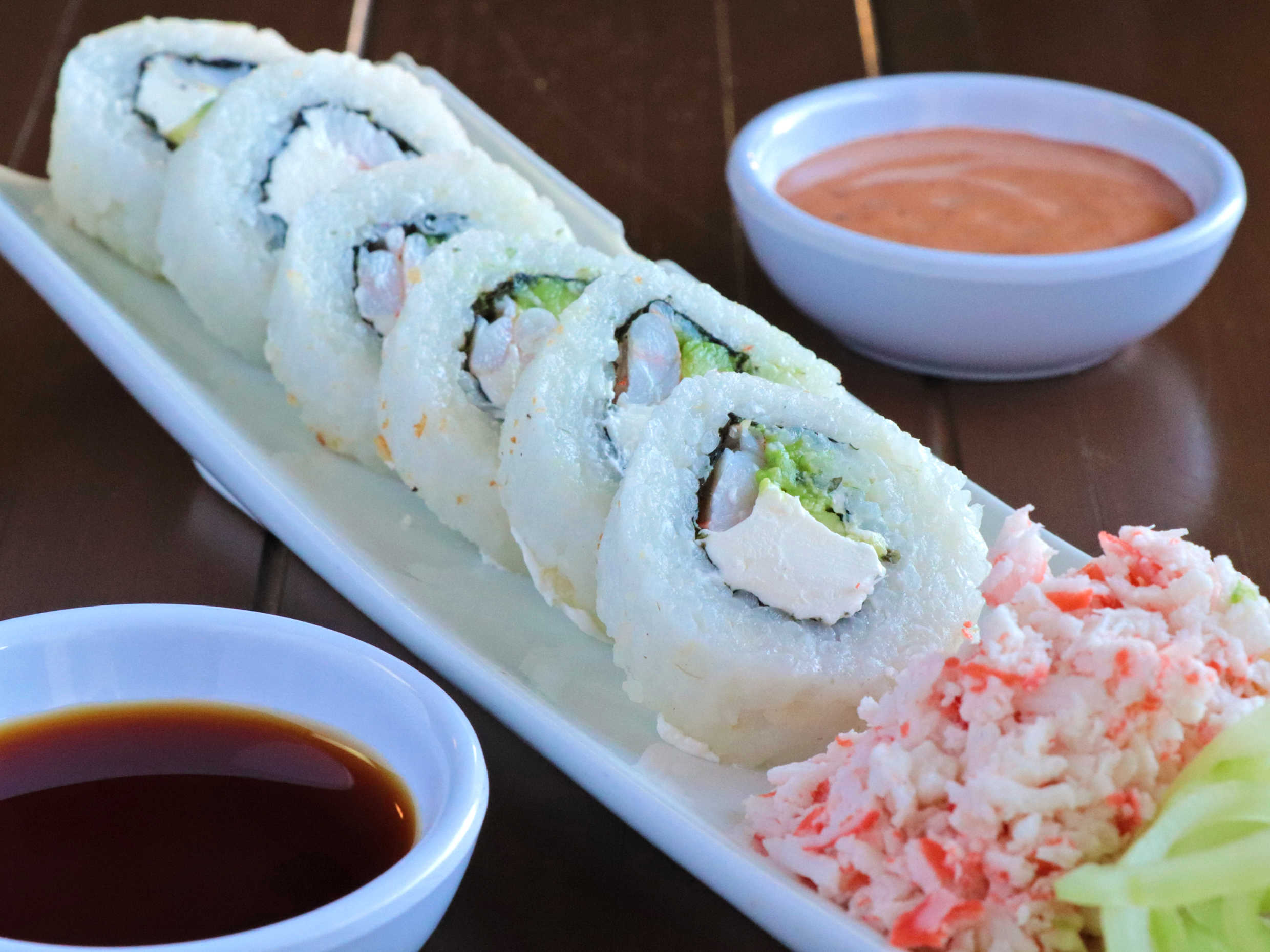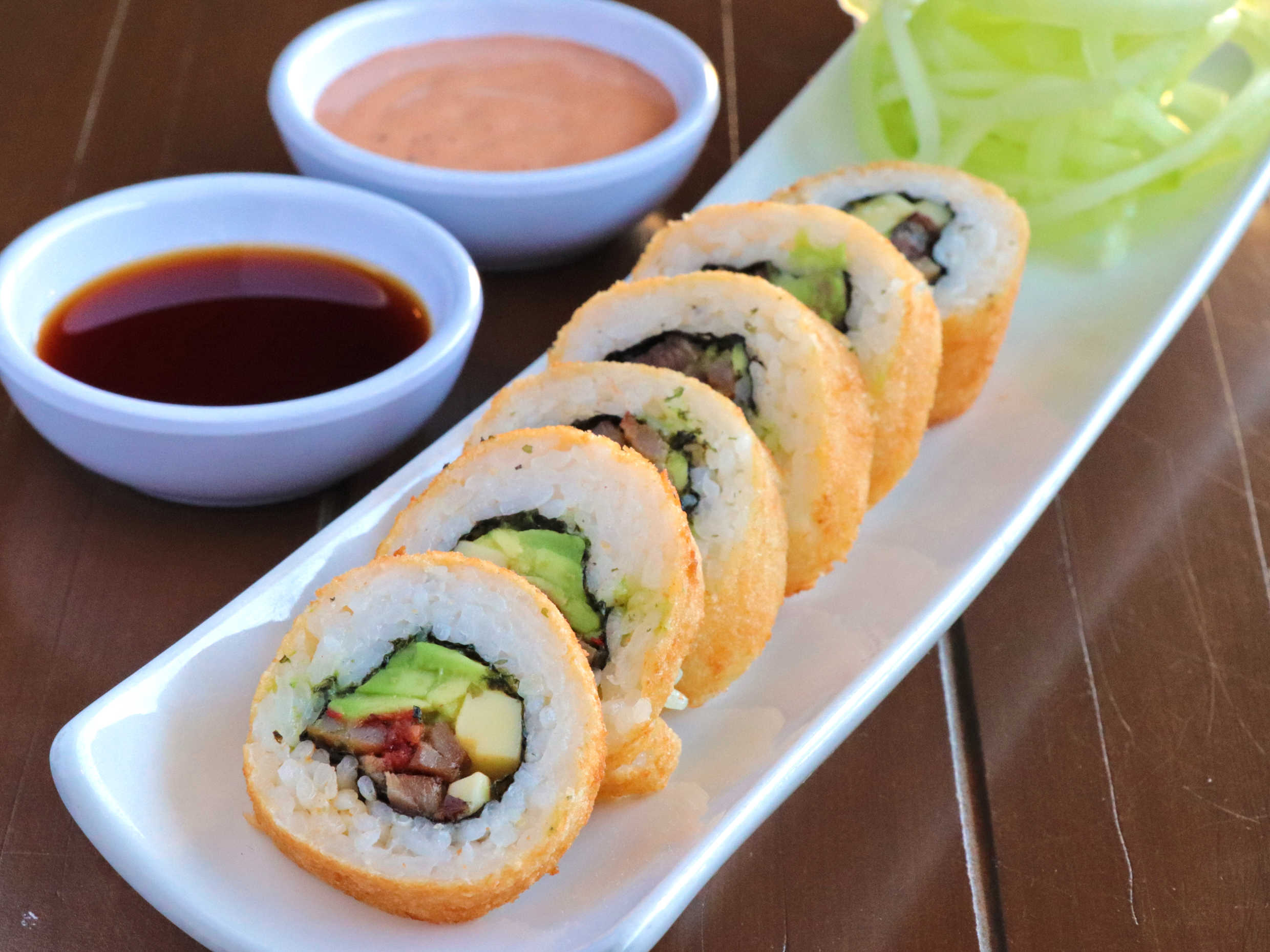 Por dentro aguacate, philadelphia y camarón. Por fuera pasta tampico.