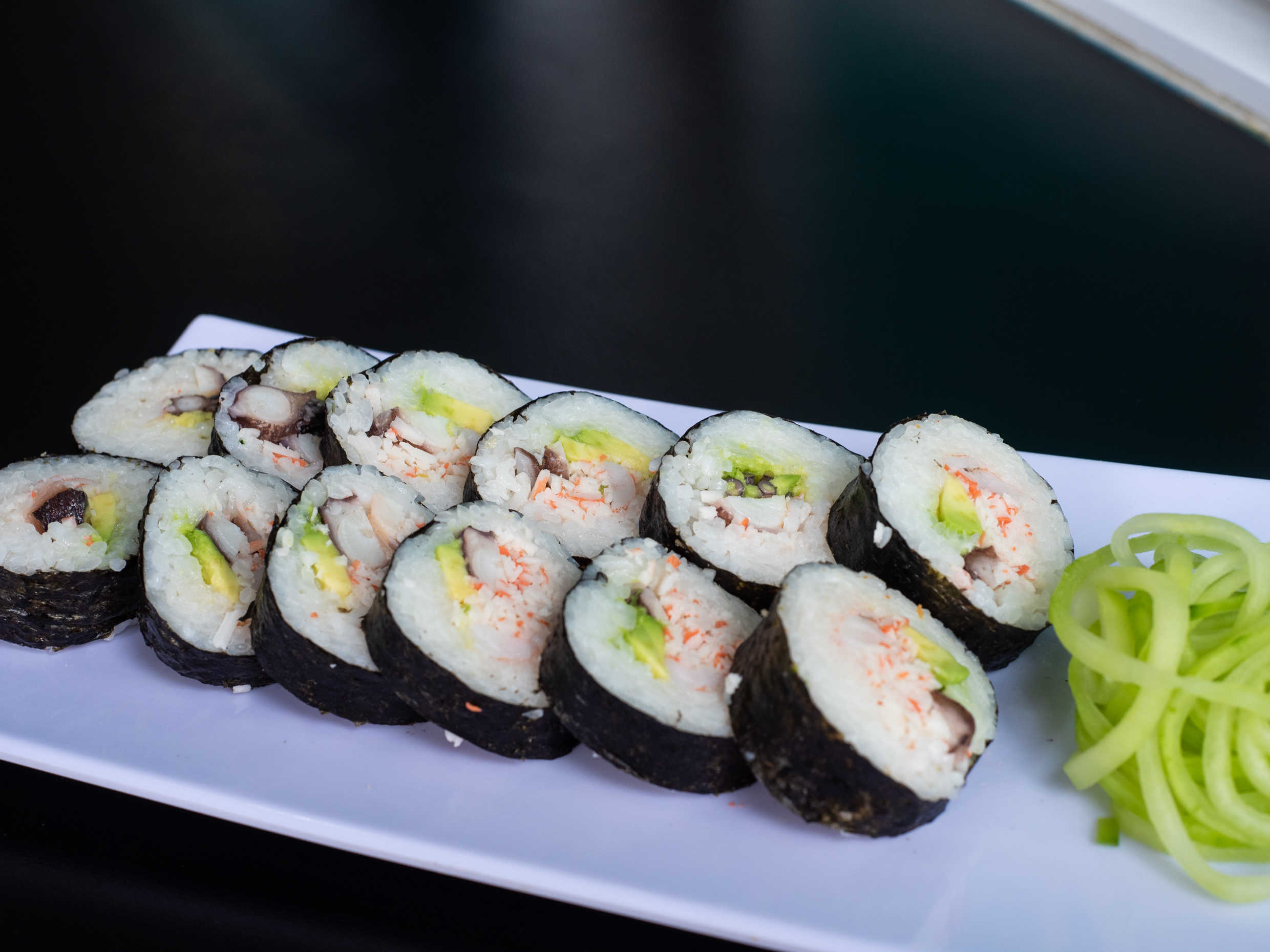Por dentro aguacate, pepino y surimi. Por fuera kanikama.
