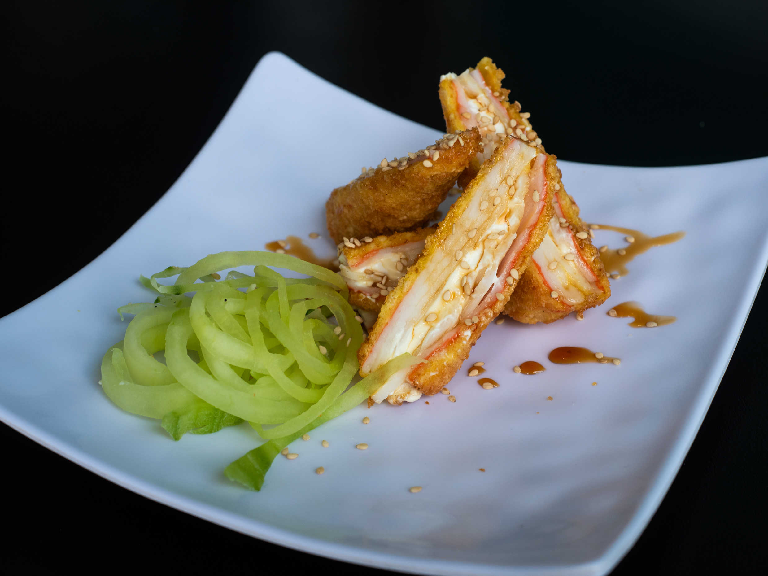 Barra de surimi, rellena de philadelphia. Empanizada y bañada en salsa anguila y ajonjolí. (1 Pieza).