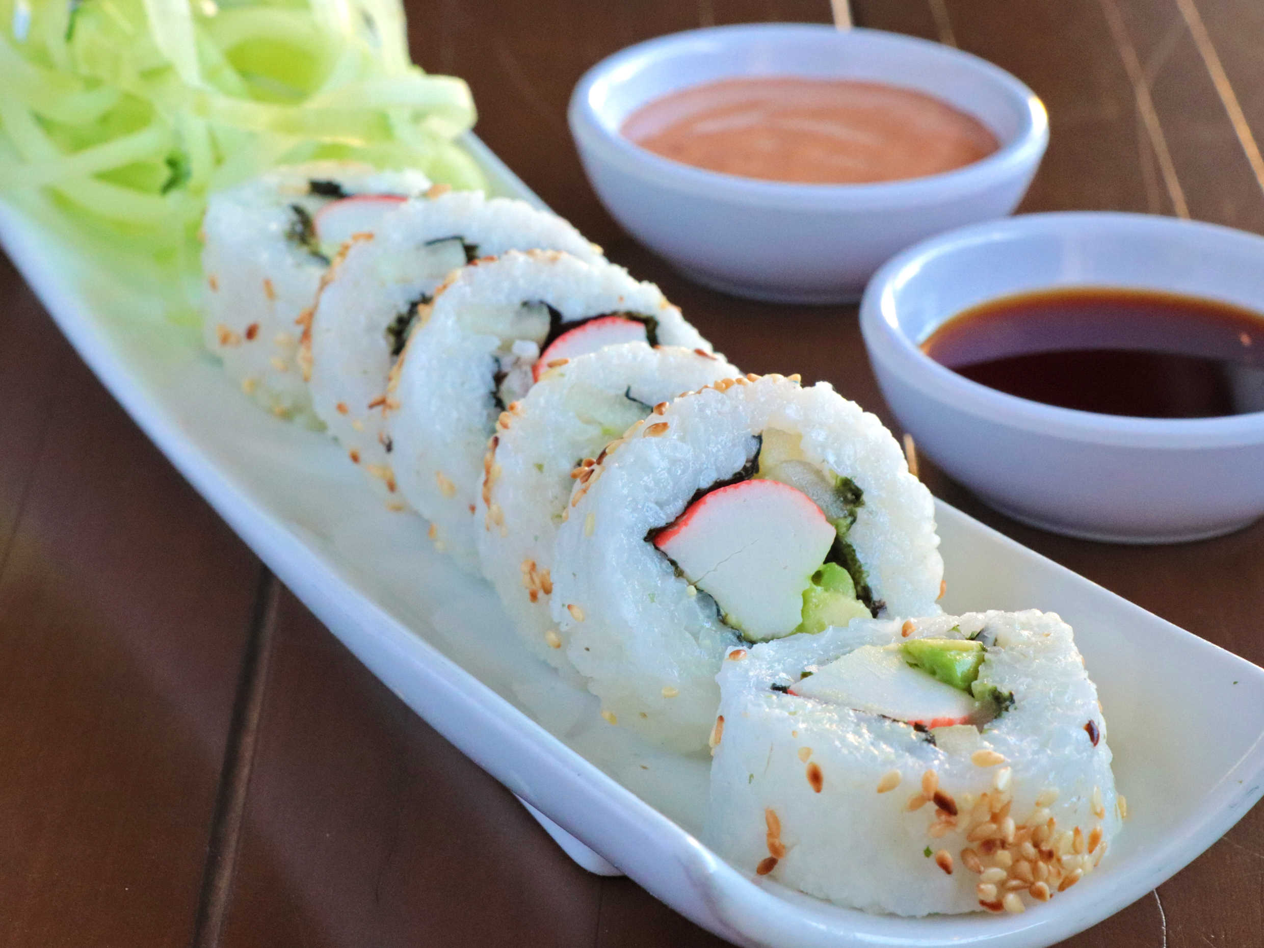 Por dentro aguacate, pepino y surimi. Por fuera ajonjolí.