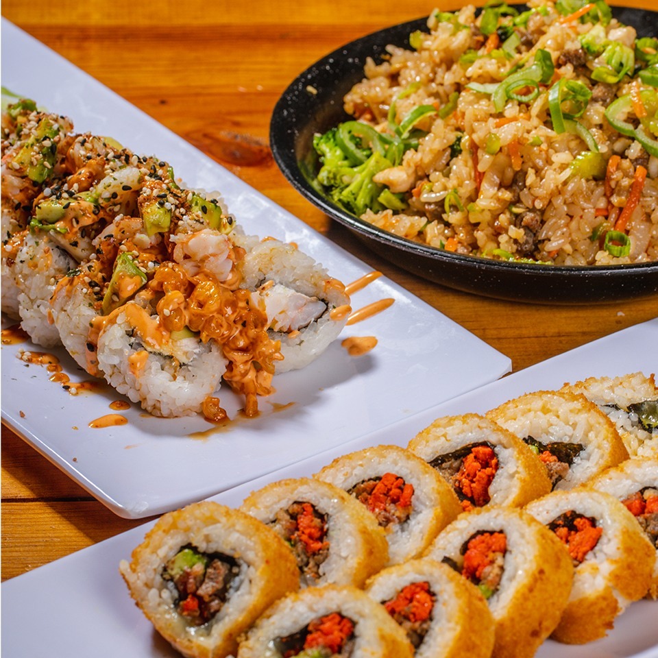 2 rollos a elegir (todos los rollos) 1 arroz a elegir (res, pollo, res y pollo, mixto)