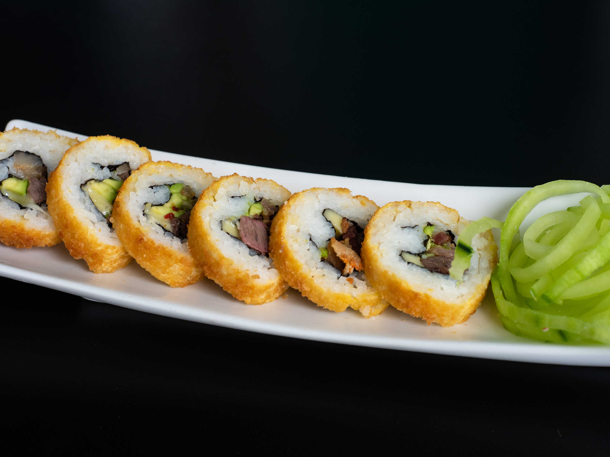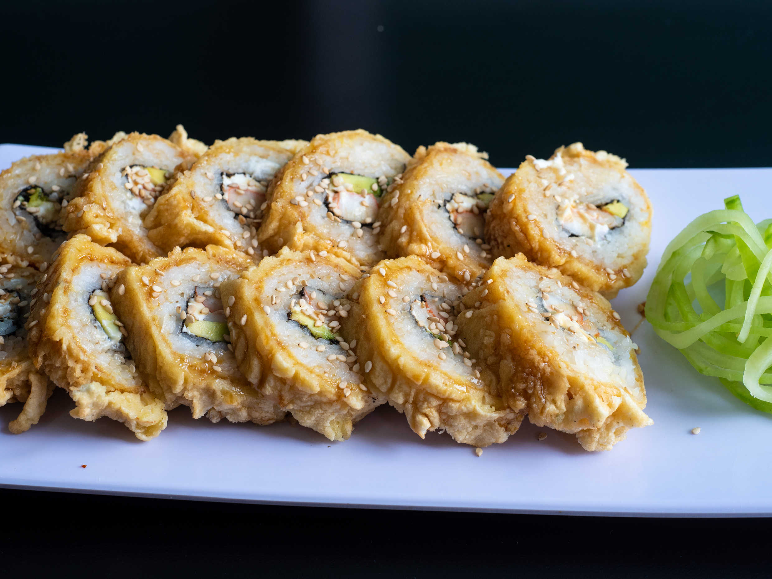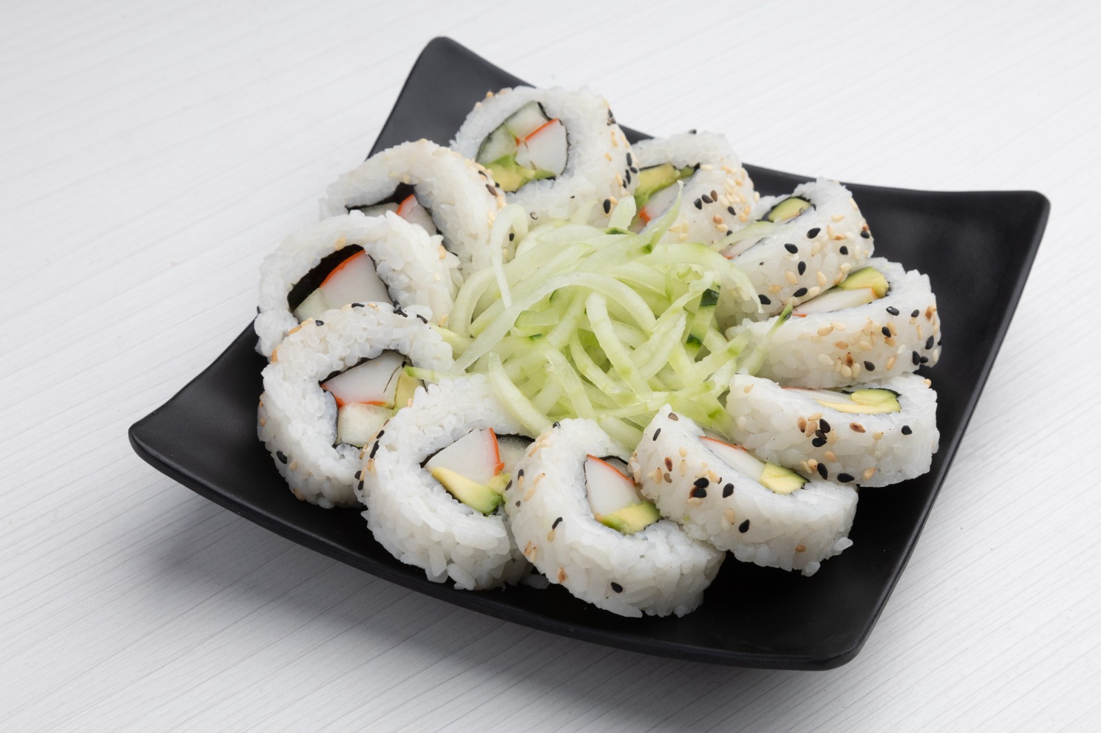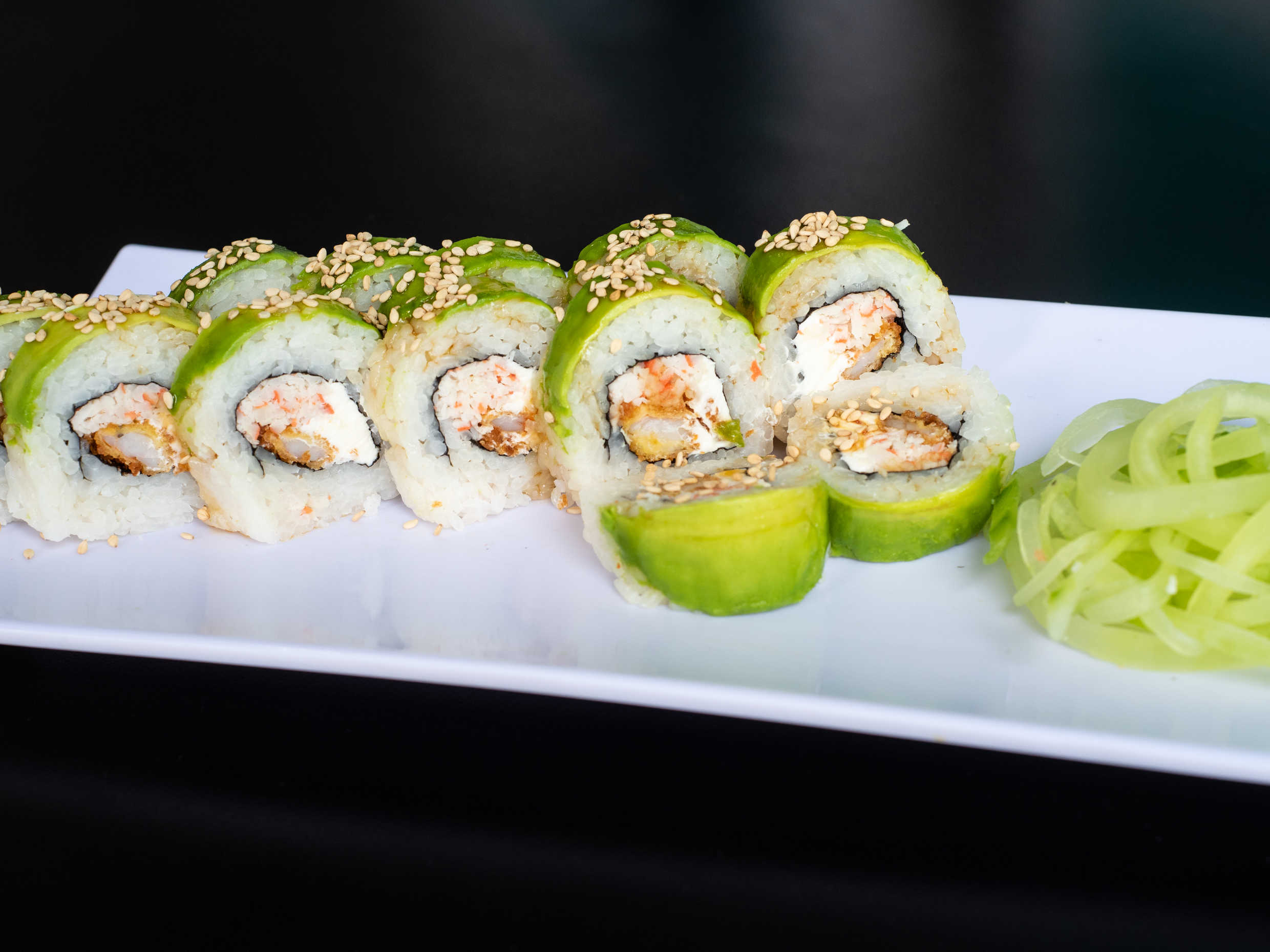 Por dentro aguacate, pepino y surimi. Por fuera ajonjolí.