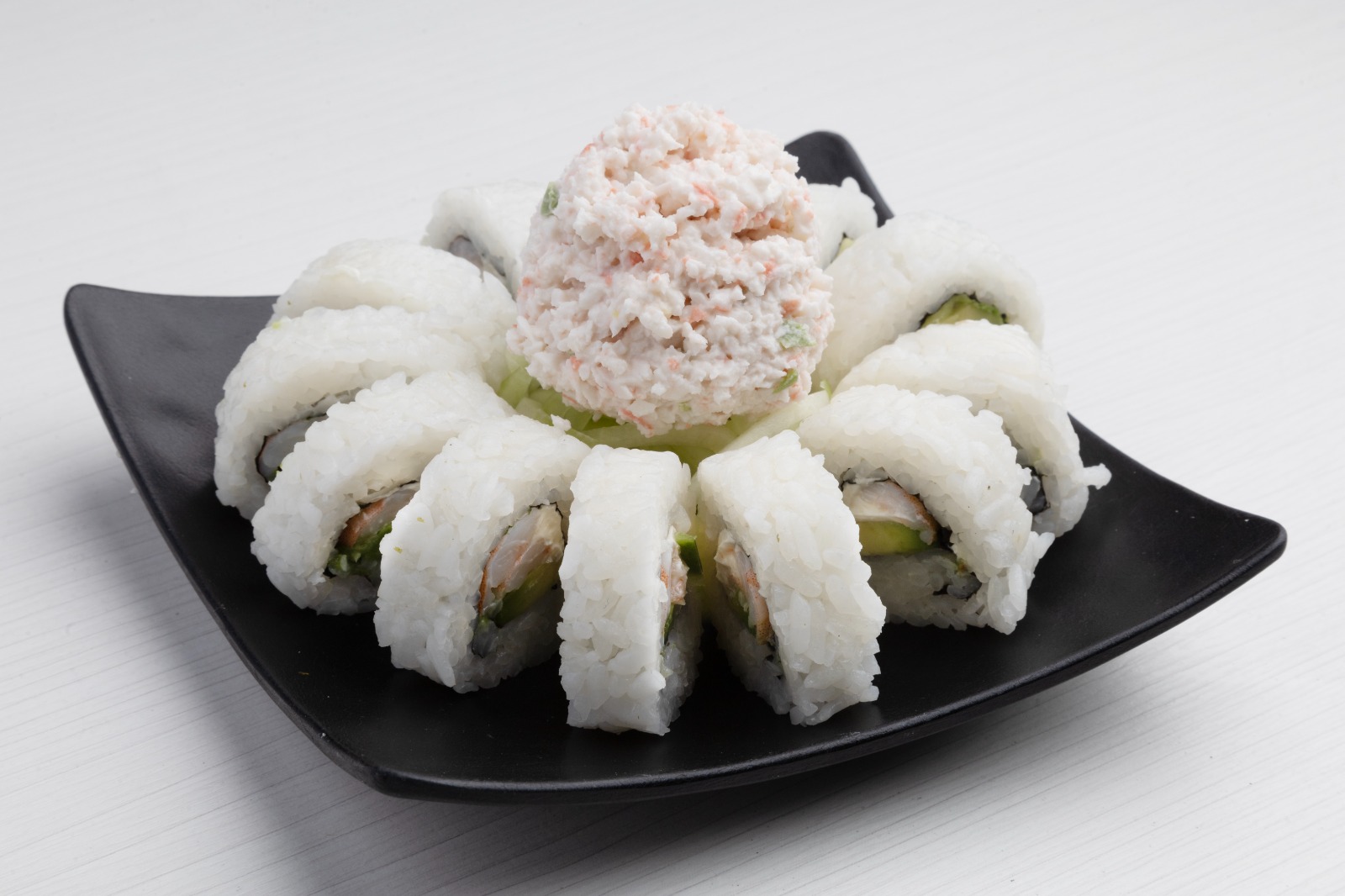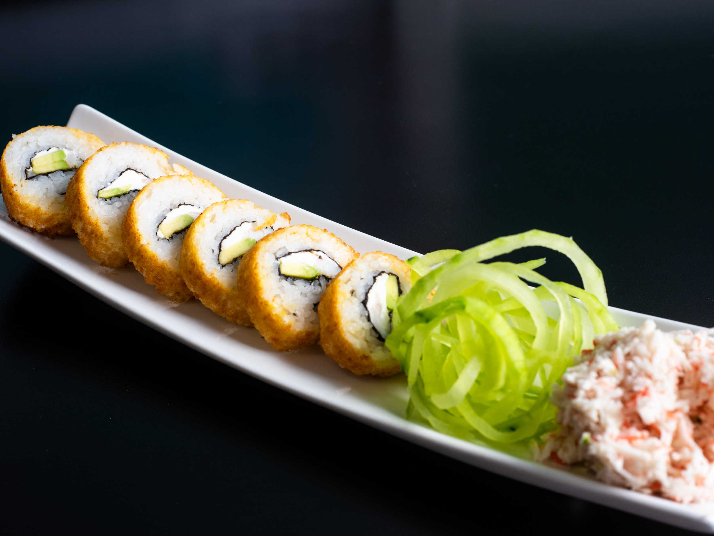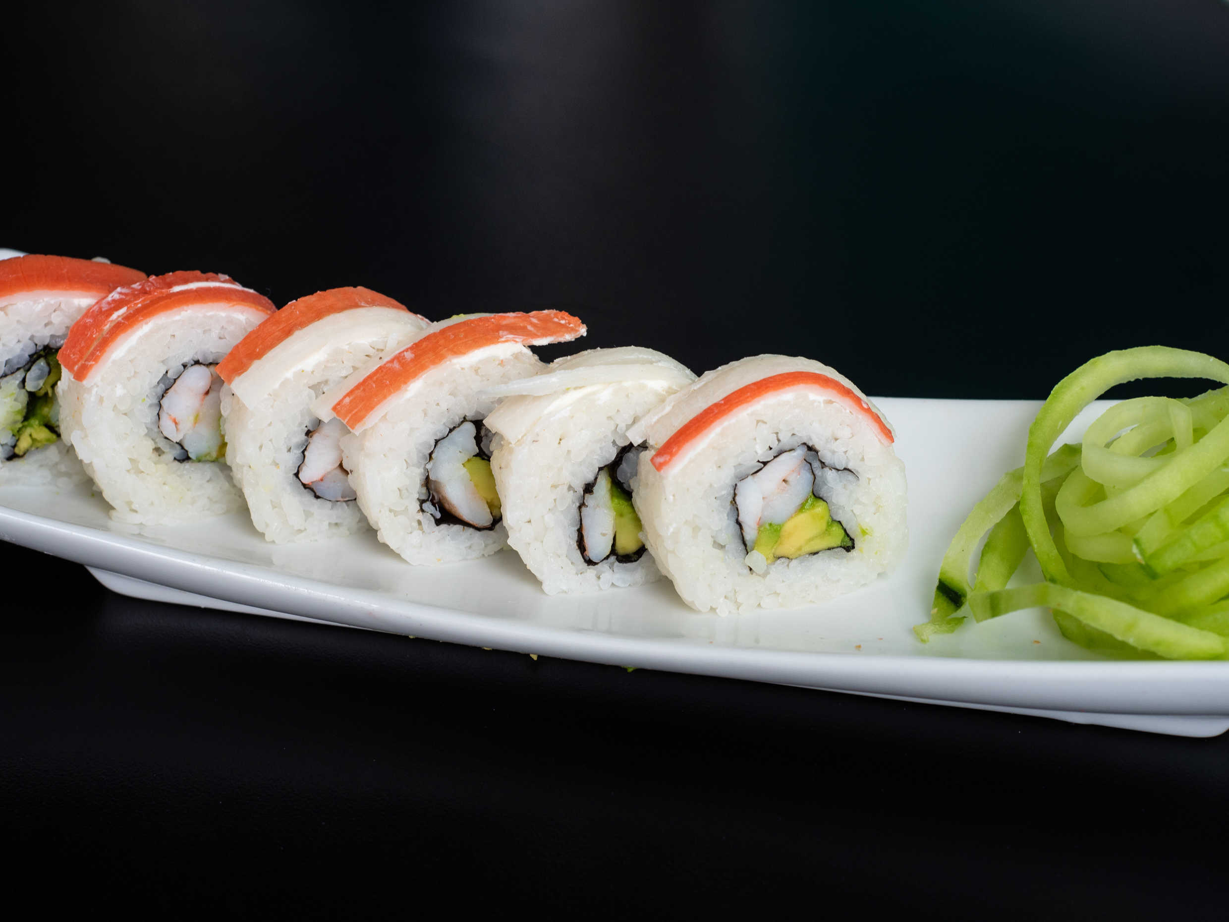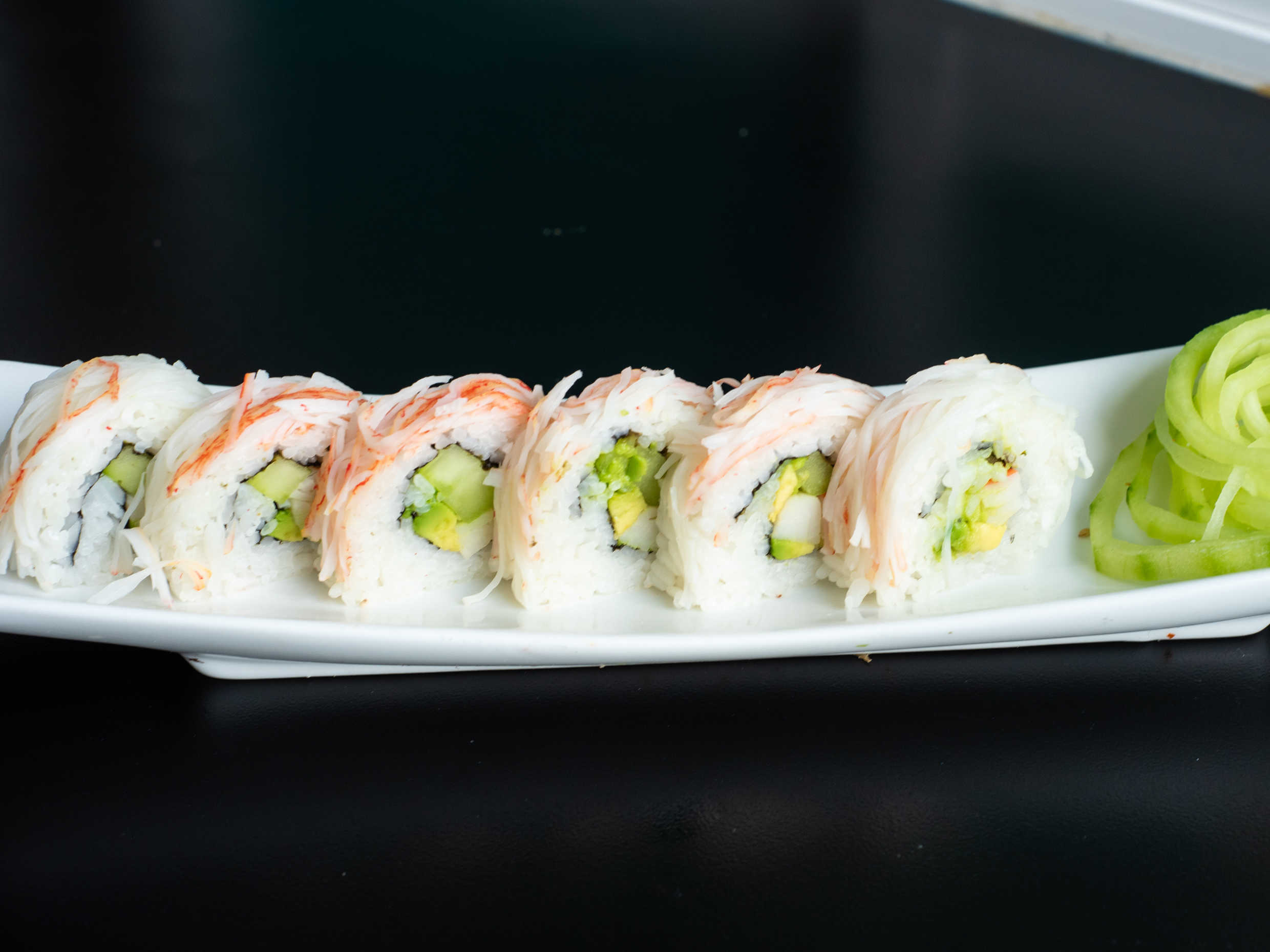 Por dentro aguacate, pepino y surimi. Por fuera ajonjolí.