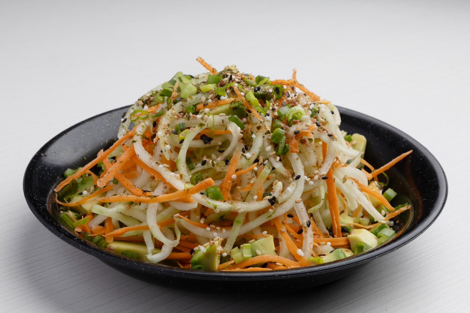Por dentro aguacate, zanahoria y pepino. Por fuera ajonjolí.