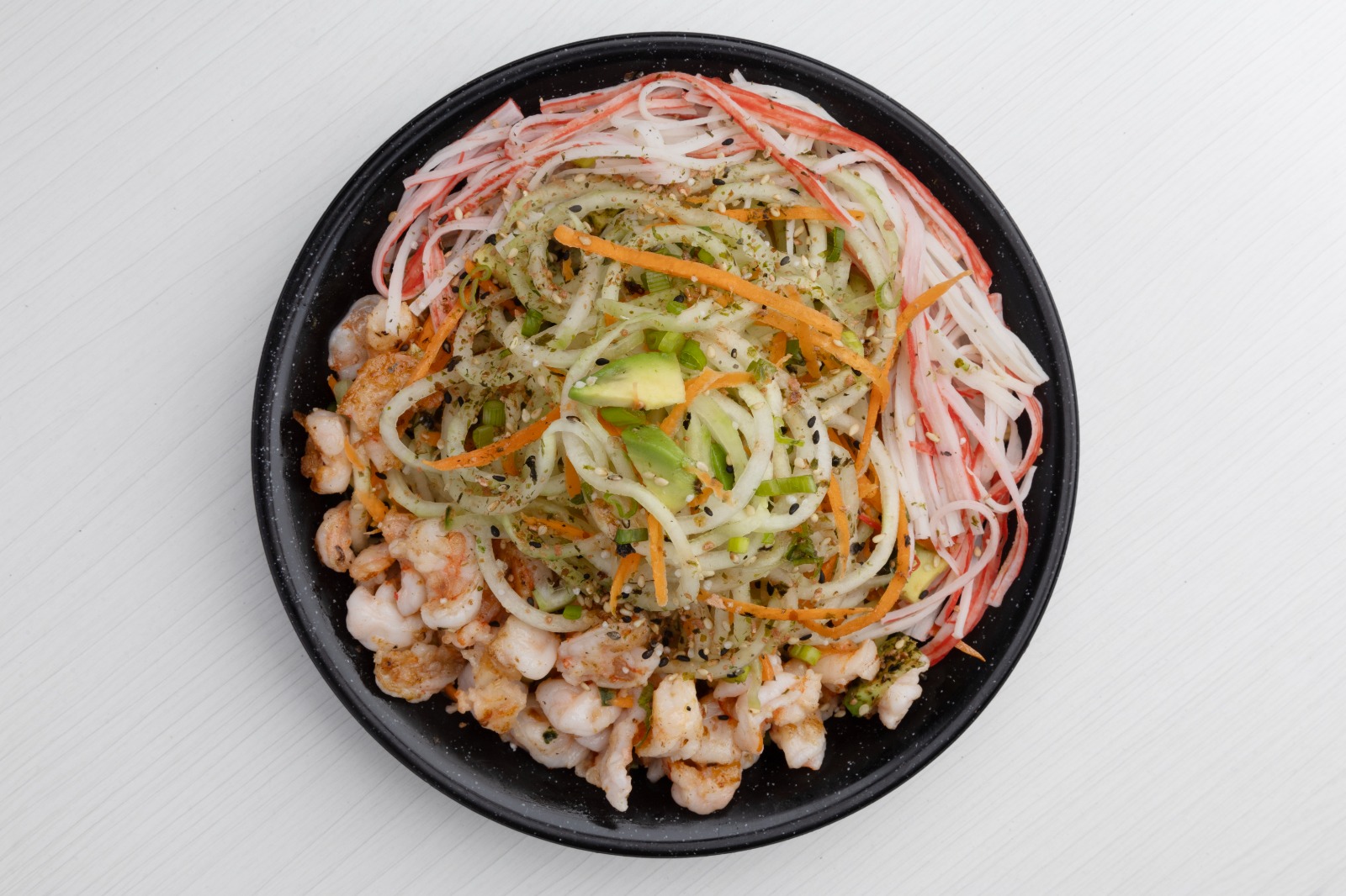 Fideos de pepino acompañado de camaron, kanikama, sazonado con furikake y vinagre.