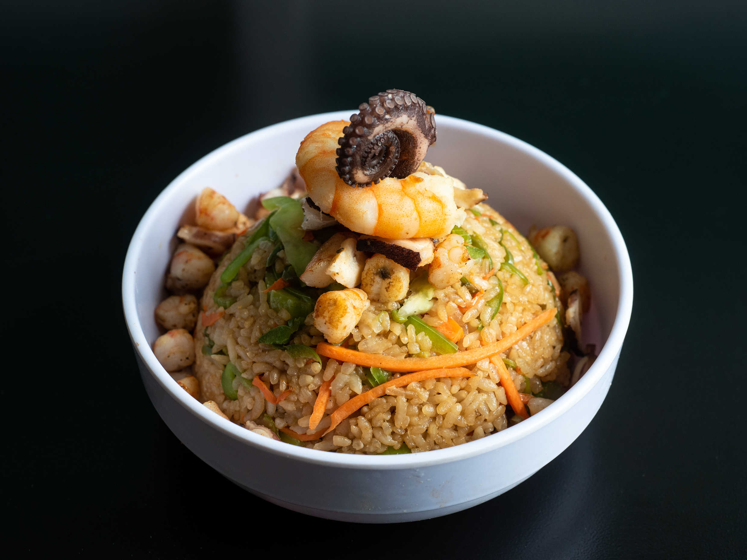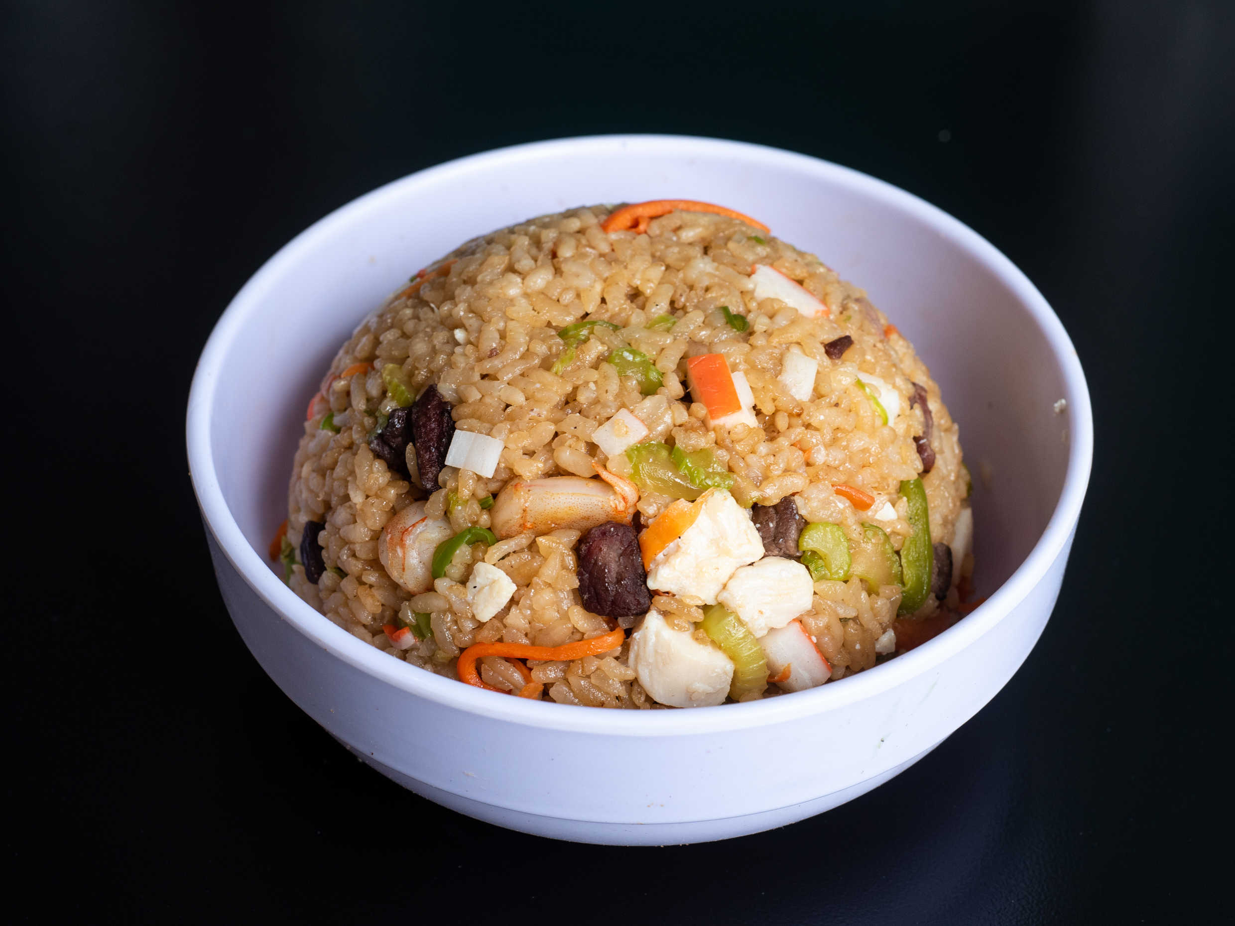Arroz frito con res, pollo, surimi, camaron, zanahoria, apio y morrón. Mezclado con salsa de soya preparada.