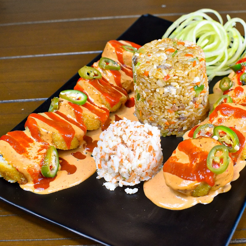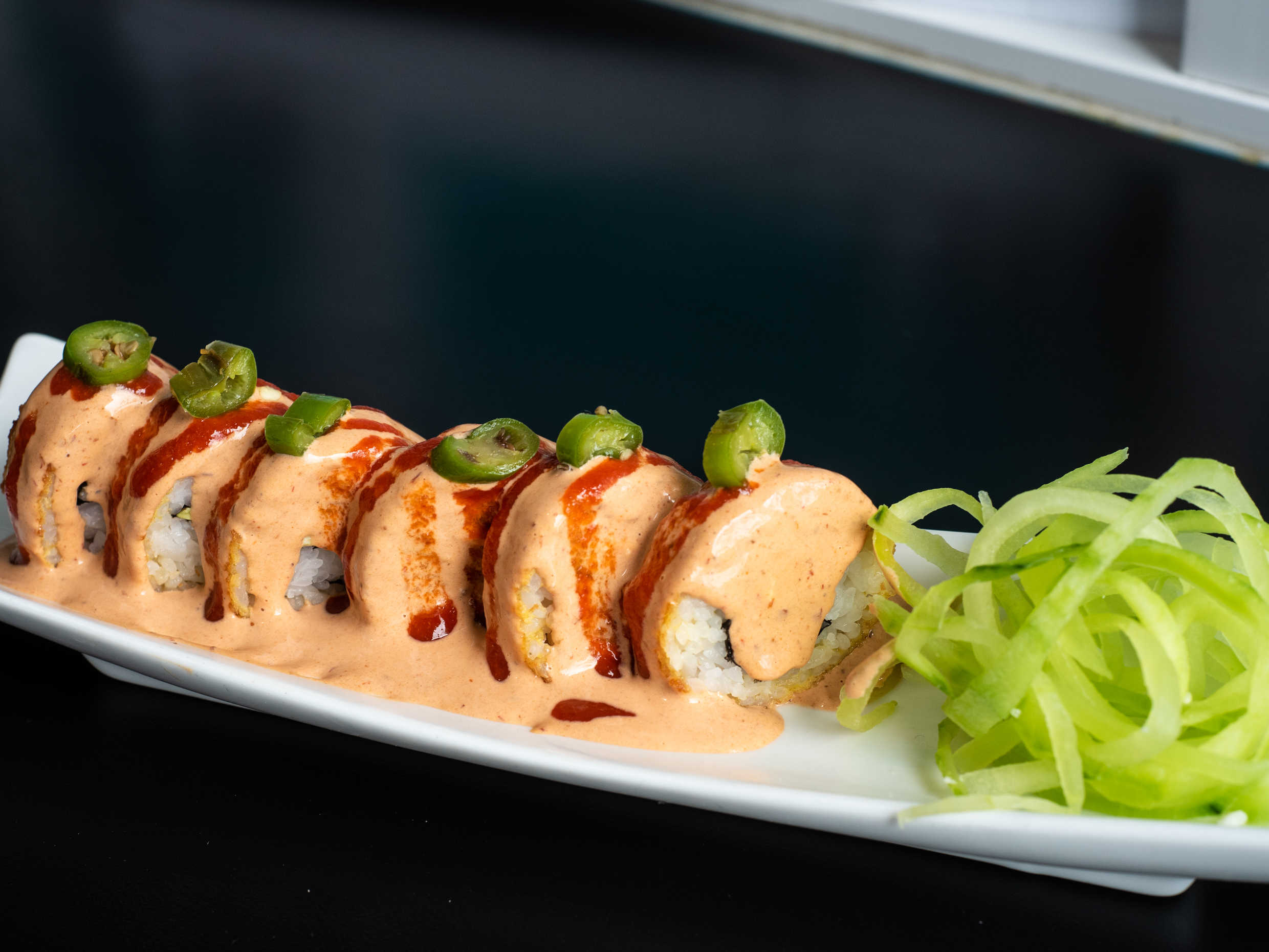 Por dentro aguacate, philadelphia, chile toreado y camarón. Por fuera bañado en salsa spicy y sriracha.
