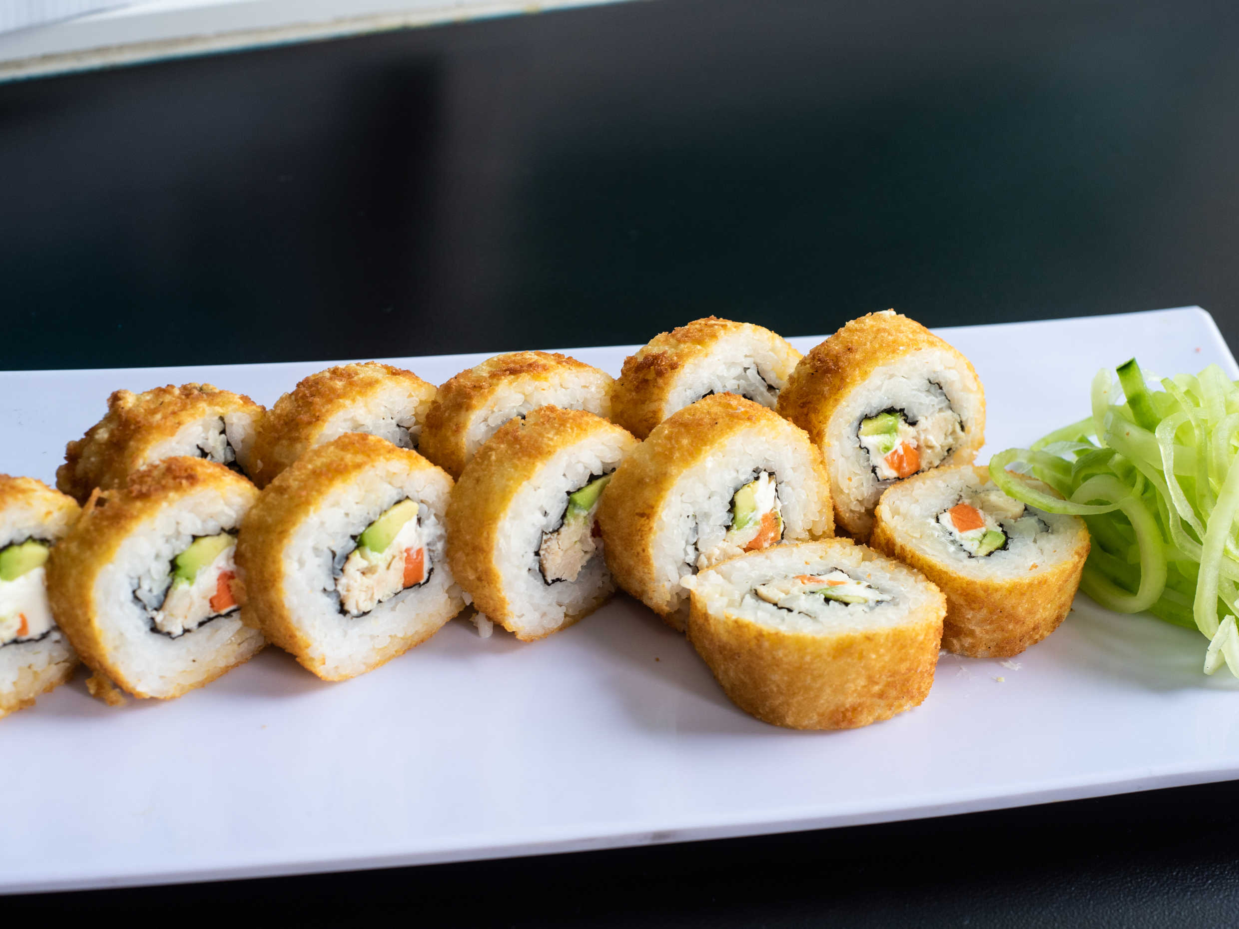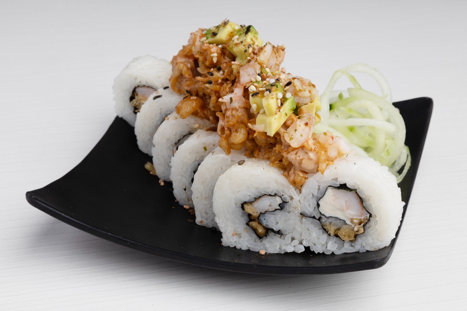Por dentro aguacate, philadelphia y camarón. Por fuera pasta tampico.
