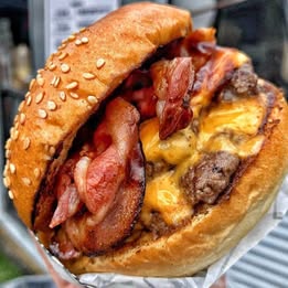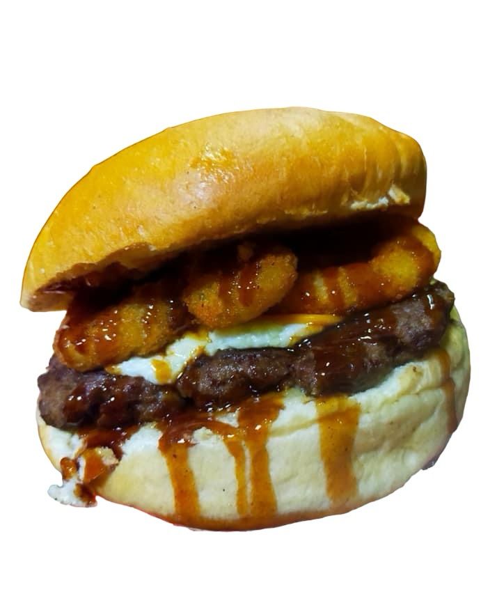 Pan recién horneado, 180 g de carne de hamburguesa casera, mezcla de quesos, aros de cebolla empanizados, tocino, salsa BBQ y mezcla de aderezos.