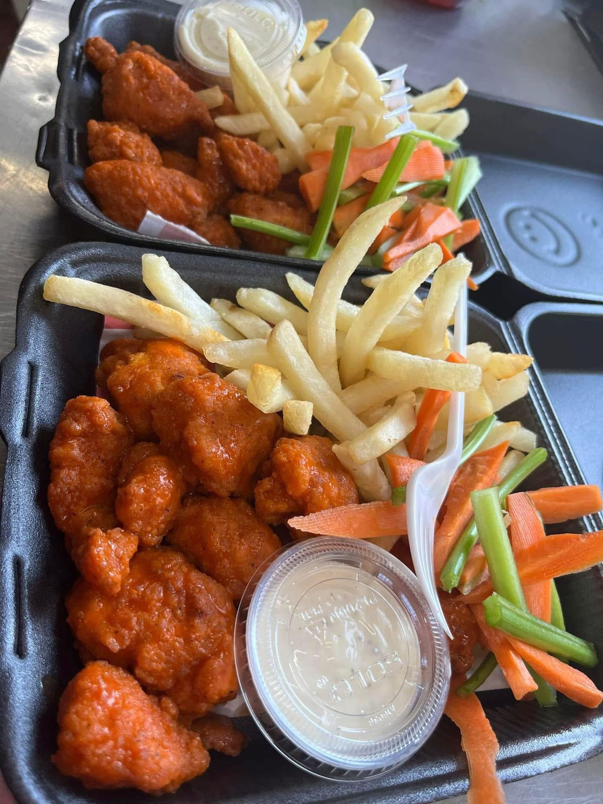 18pz De boneless de pechuga de pollo bañados en la salsa de tu elección, zanahoria, apio y aderezo ranch.