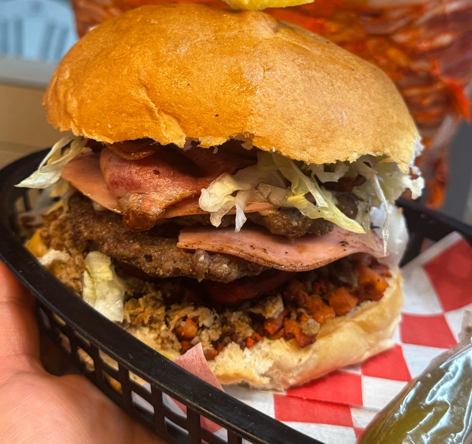 Pan recién horneado, 180 g de hamburguesa casera, muuucha mezcla de quesos, queso americano, jamón, salami, mezcla de aderezos, lechuga, tomate y guacamole.