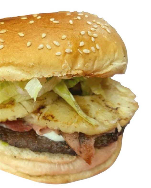 Pan recién horneado, 180 g de hamburguesa casera, mezcla de quesos, jamón, salami, mezcla de aderezos, lechuga, tomate, guacamole y rebanada de piña.