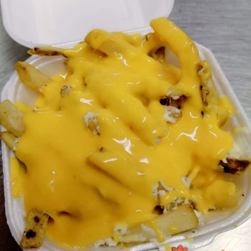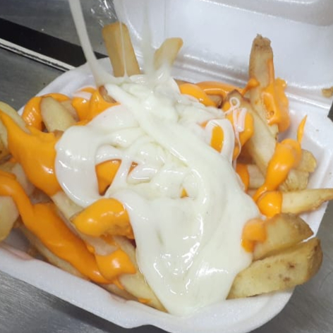 250 g De papas fritas bañadas en queso cheddar y queso chihuahua.