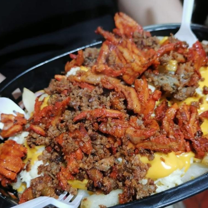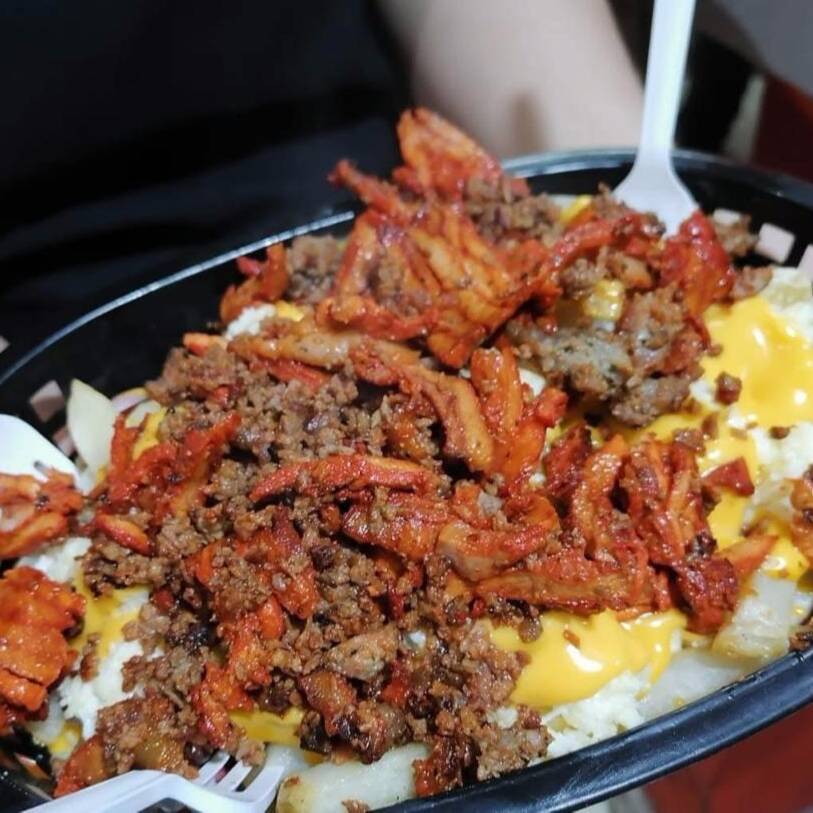 250g De papas fritas bañadas con queso cheddar, queso chihuahua, carne asada y trompo.