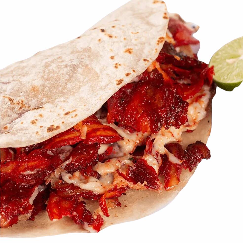 Tortilla de harina 20cm, carne de trompo al pastor, queso chihuahua, cebolla con papa galeana doradita, cebolla con cilantro, limón, salsas.