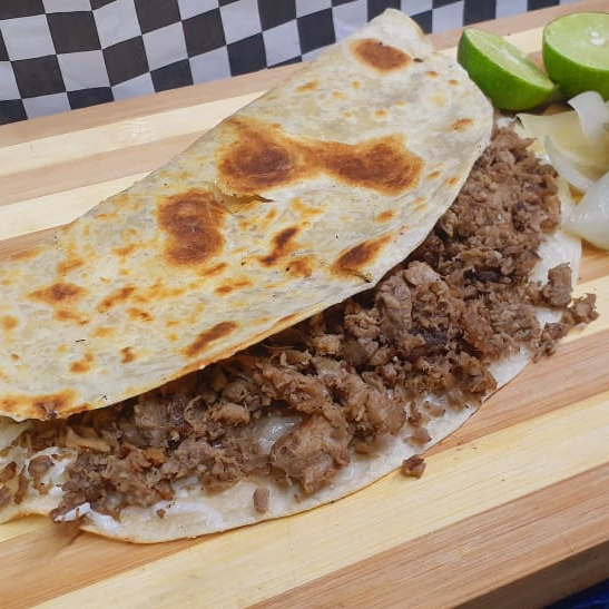 Tortilla de harina 20cm, carne adobada al pastor y bistec de res, queso chihuahua, cebolla con papa galeana dorada, cebolla con cilantro, salsas, limón.