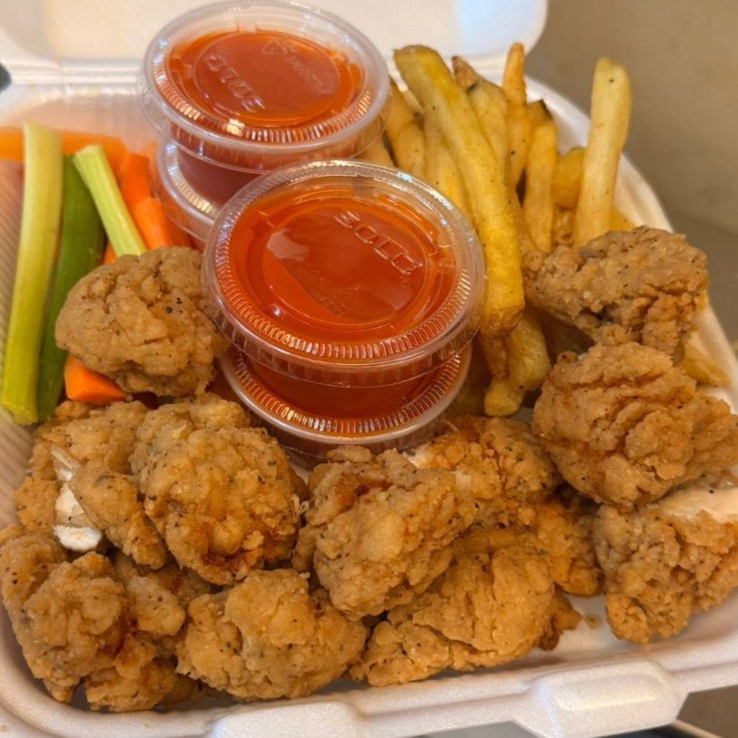 10pz De boneless de pechuga de pollo bañados en la salsa de tu elección, acompañados de papas fritas, zanahoria, apio y aderezo ranch.