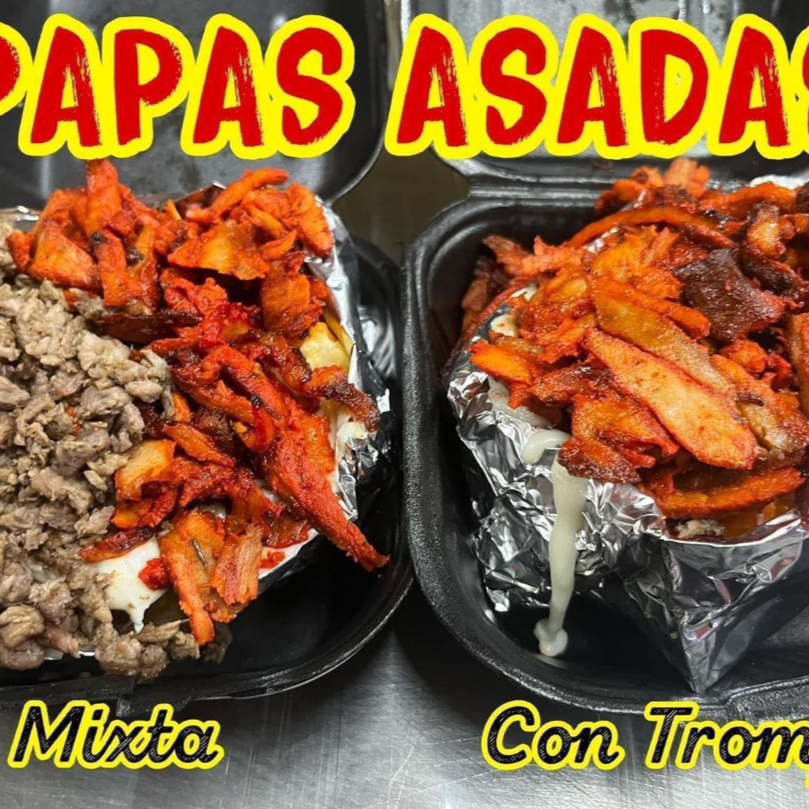 Papa Asada con mantequilla, queso amarillo cheedar, queso chiuhuahua, carne de trompo o carne de bistec, galletas saladas, chile jalapeño y salsa.