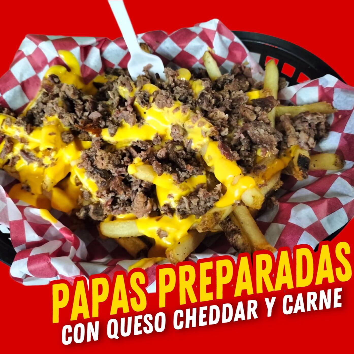 250 g De papas fritas bañadas con queso cheddar, queso chihuahua y carne asada.
