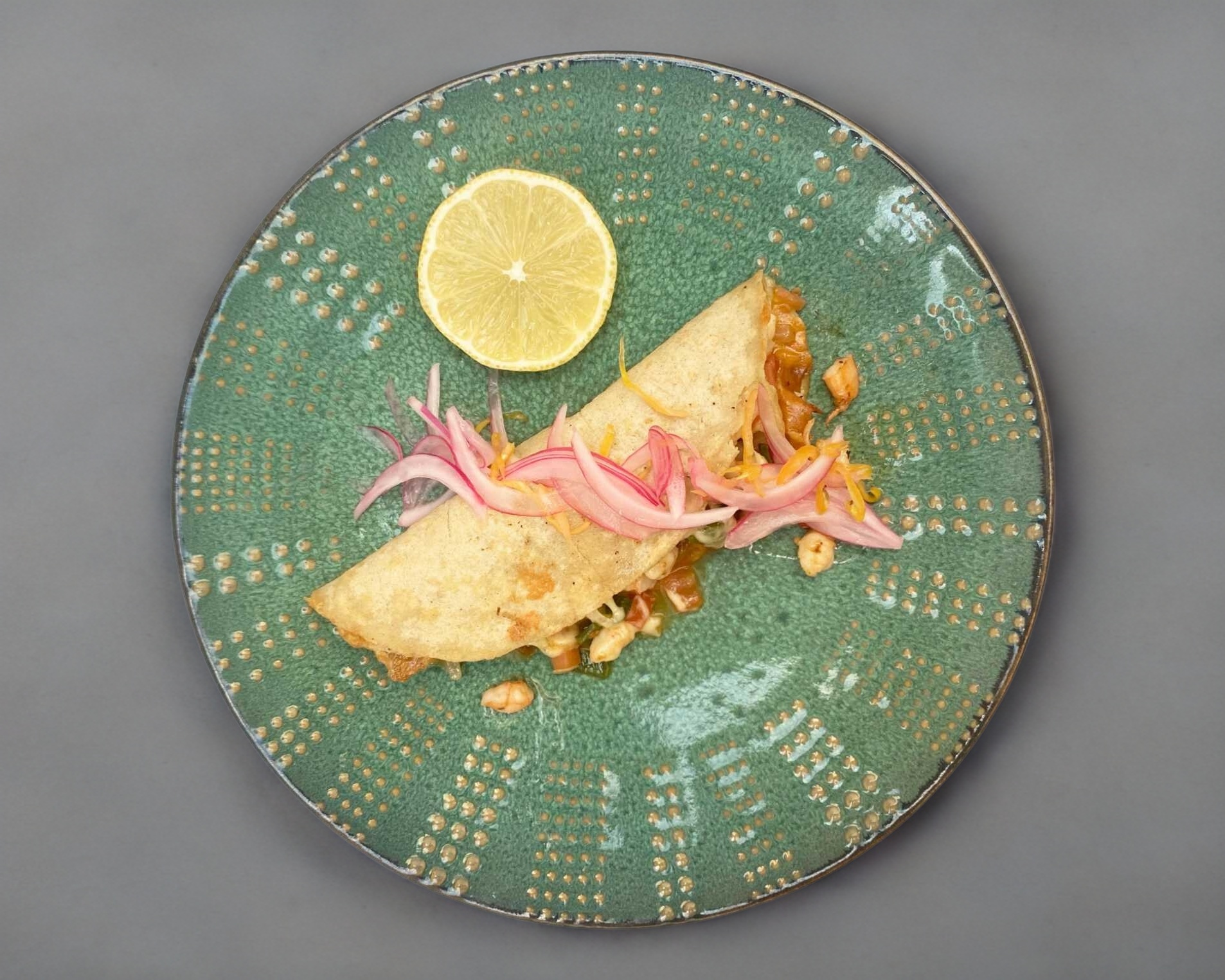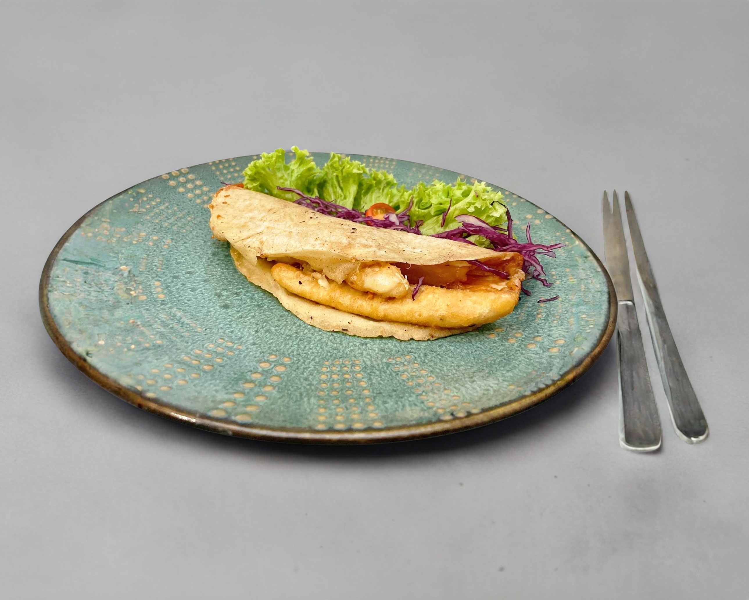 Taco grande de tortilla nixtamalizada con costra de queso gouda rellena de pescado rebozado en tempura.