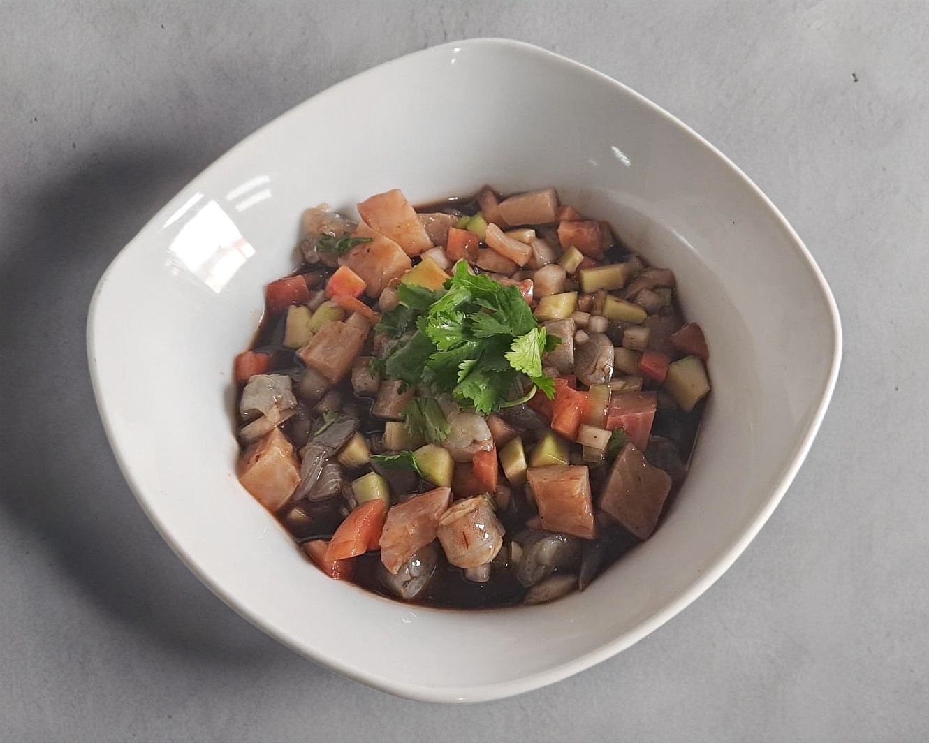 Mezcla de pescado y camarón marinado con cebolla y pepino, tomate y cilantro.