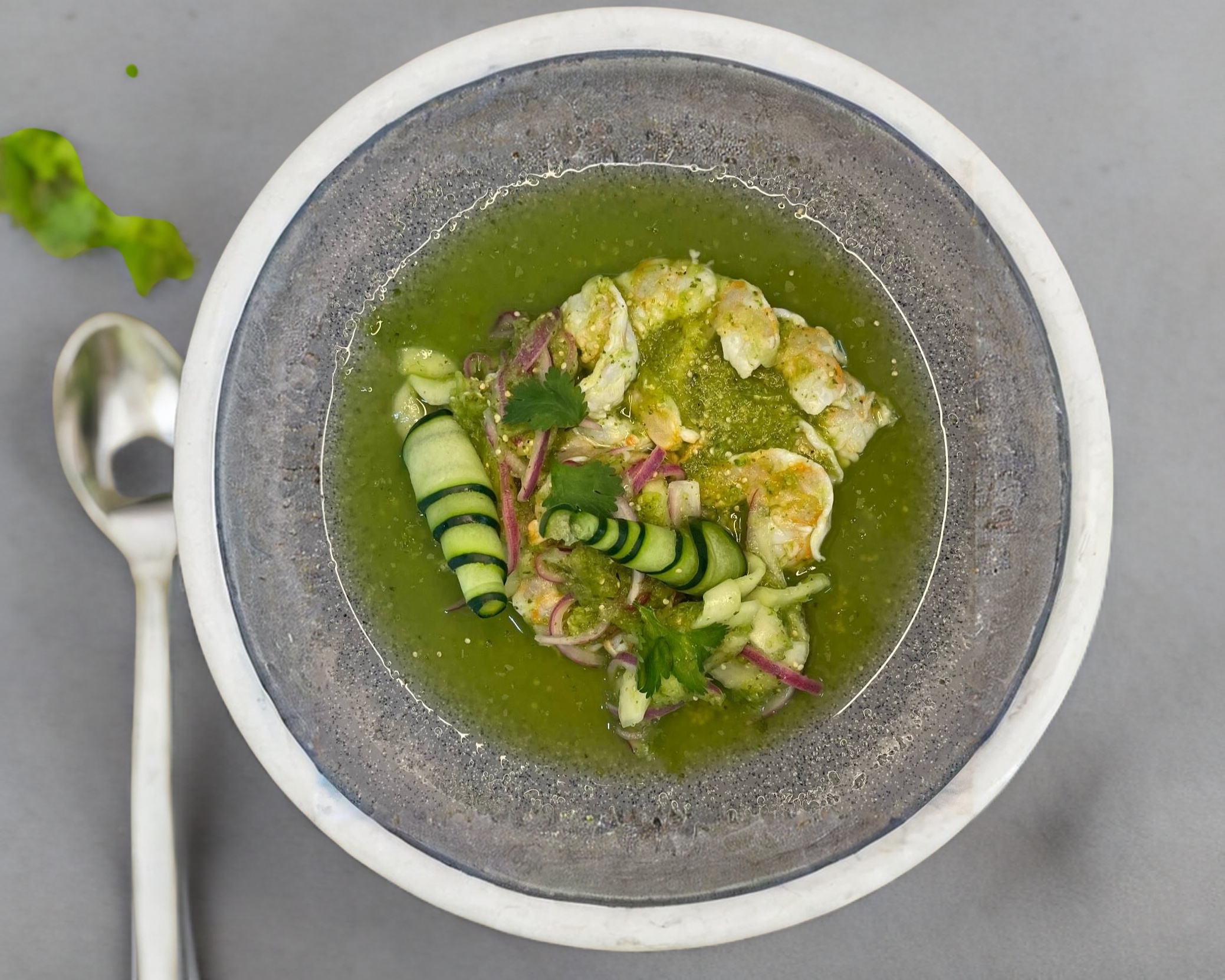 Camarón curtido en una mezcla de limón, chile serrano y cilantro acompañado de pepino, cebolla morada