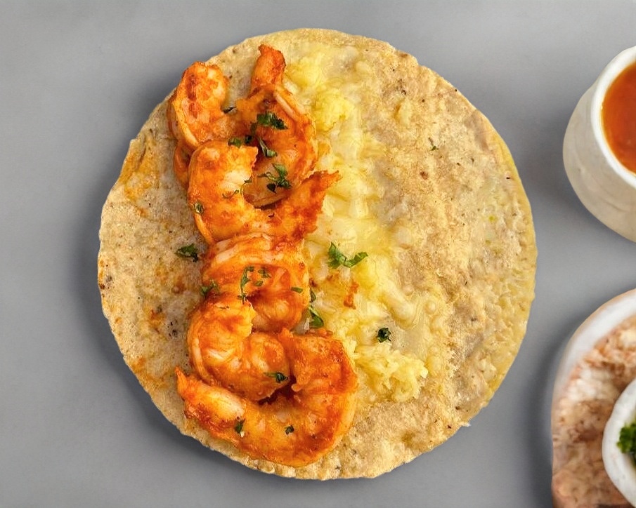 Taco grande de tortilla nixtamalizada con costra de queso gouda relleno de 80 gramos de camaron a la diabla con un toque de cilantro.