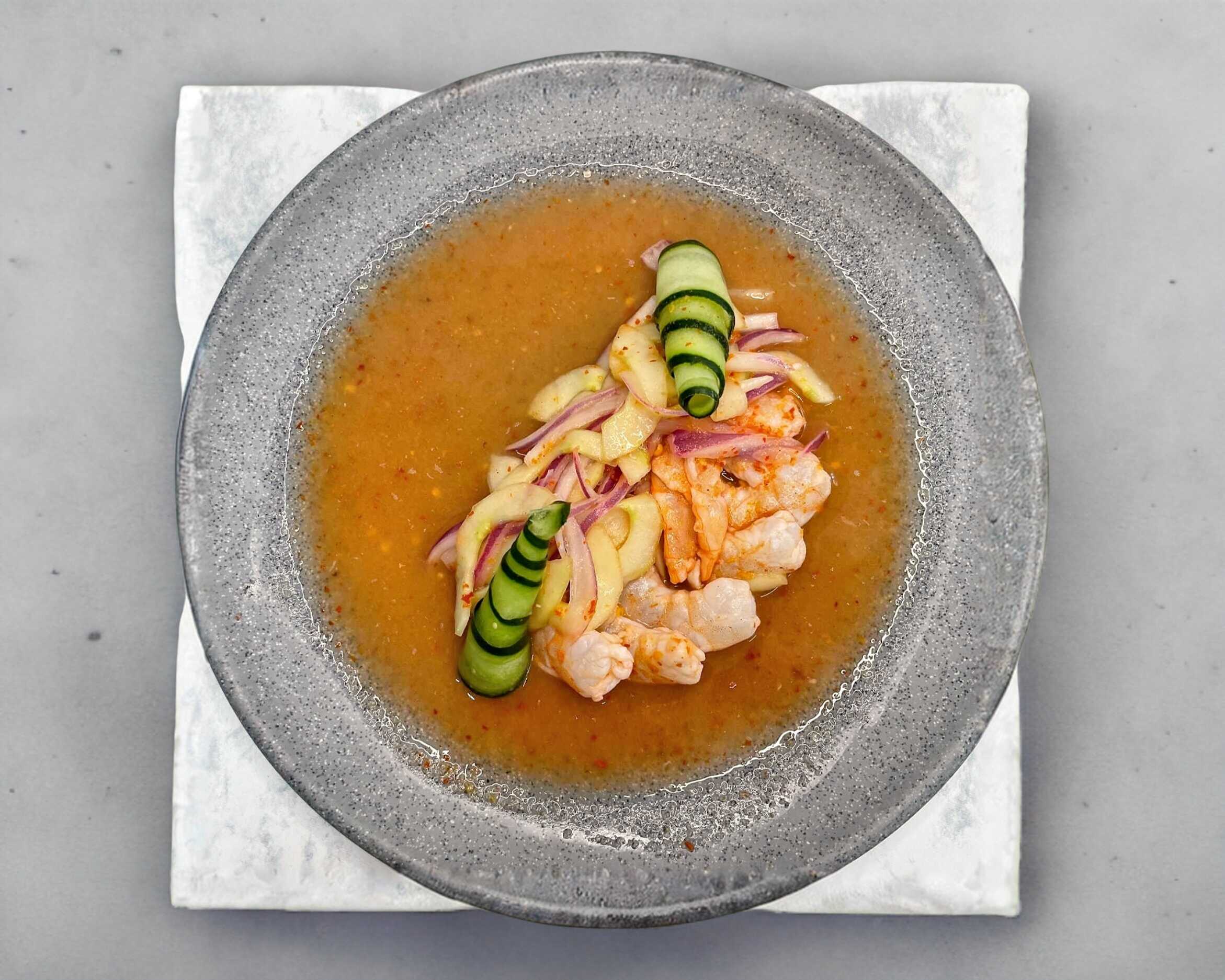Camarón curtido en una mezcla de limón, chile de arbol y cilantro acompañado de pepino, cebolla morada entre otras verduras