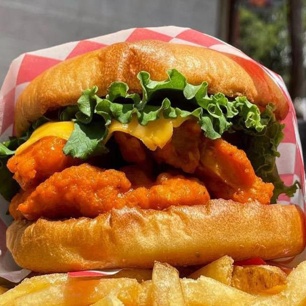 200 g Boneless bañados en búfalo, queso americano, lechuga, mayonesa y pan brioche.
