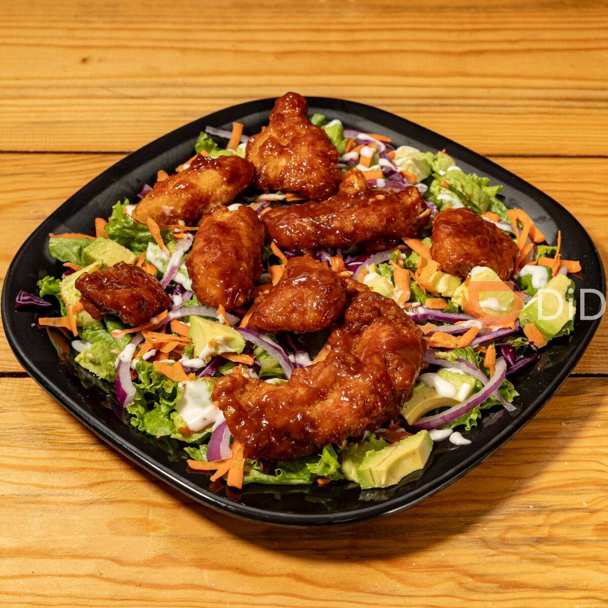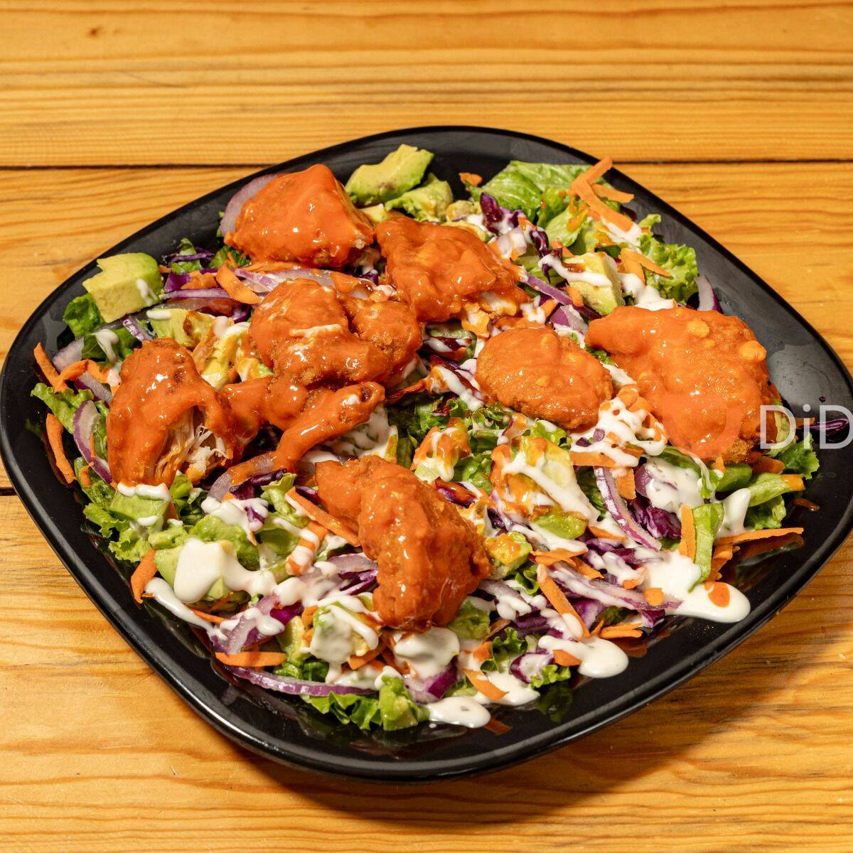 Mix de lechugas con una porción de 250 g de pollo frito empanizado, bañado en búfalo y aderezo ranch.