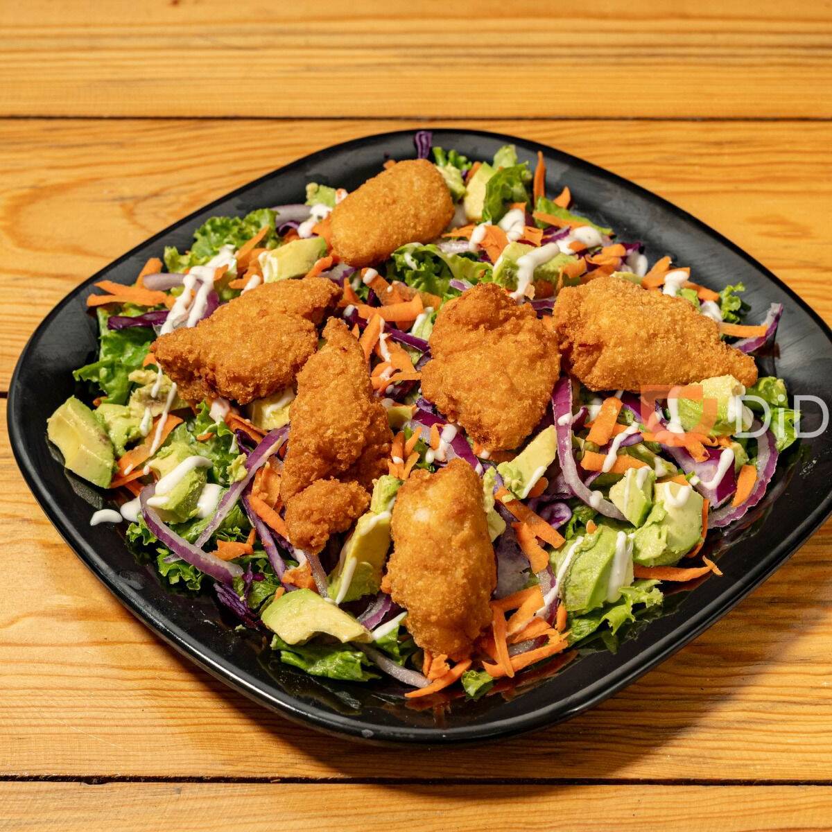 Mix de lechugas con una porción de 250 g de pollo frito empanizado y aderezo ranch.