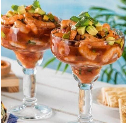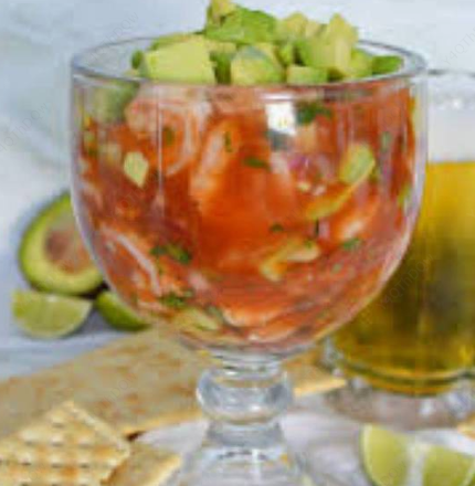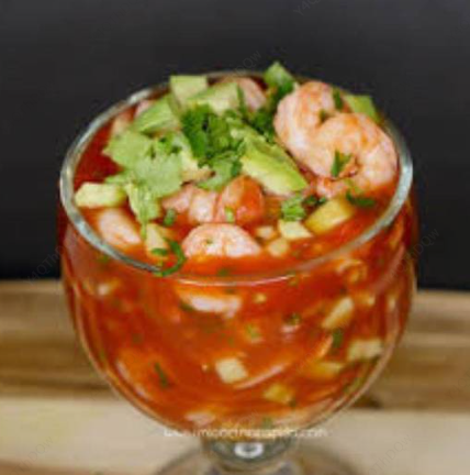 Camarón limpio desvenado, pepino, cebolla, limón aderezado con una rica salsa receta de la casa.