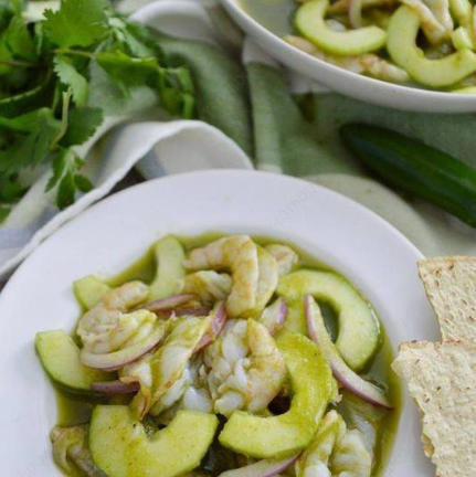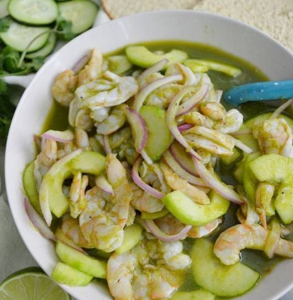 Delicioso aguachile con camarón desvenado, pepino cebolla morada, limón y aderezado con una rica salsa verde picosa.