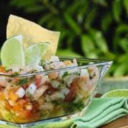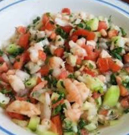 Camarón cocido, desvenado y limpio, cebolla, tomate, pepino, zanahoria, aguacate, limón, con un toque de jugo especial de la casa, (acompañado de tostadas).