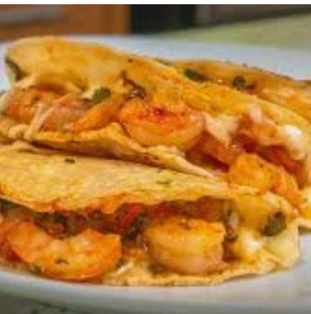 Camarón desvenado, guisado con cebolla, morrón y ajo, servido en una quesadilla.