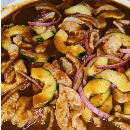 Delicioso aguachile con camarón desvenado y limpio, pepino, cebolla morada, limón, aderezado con una rica salsa negra receta de la casa (muy picante).