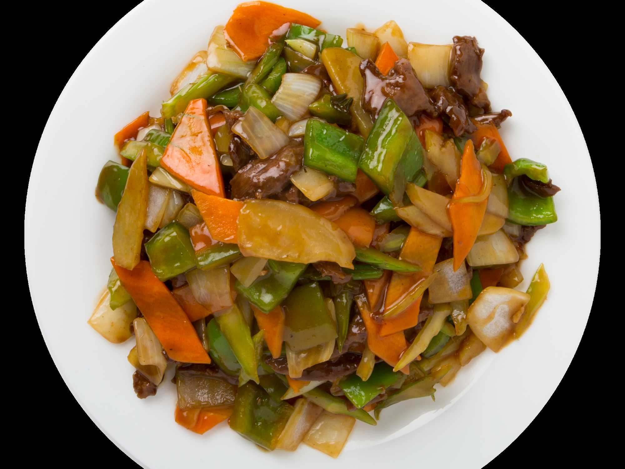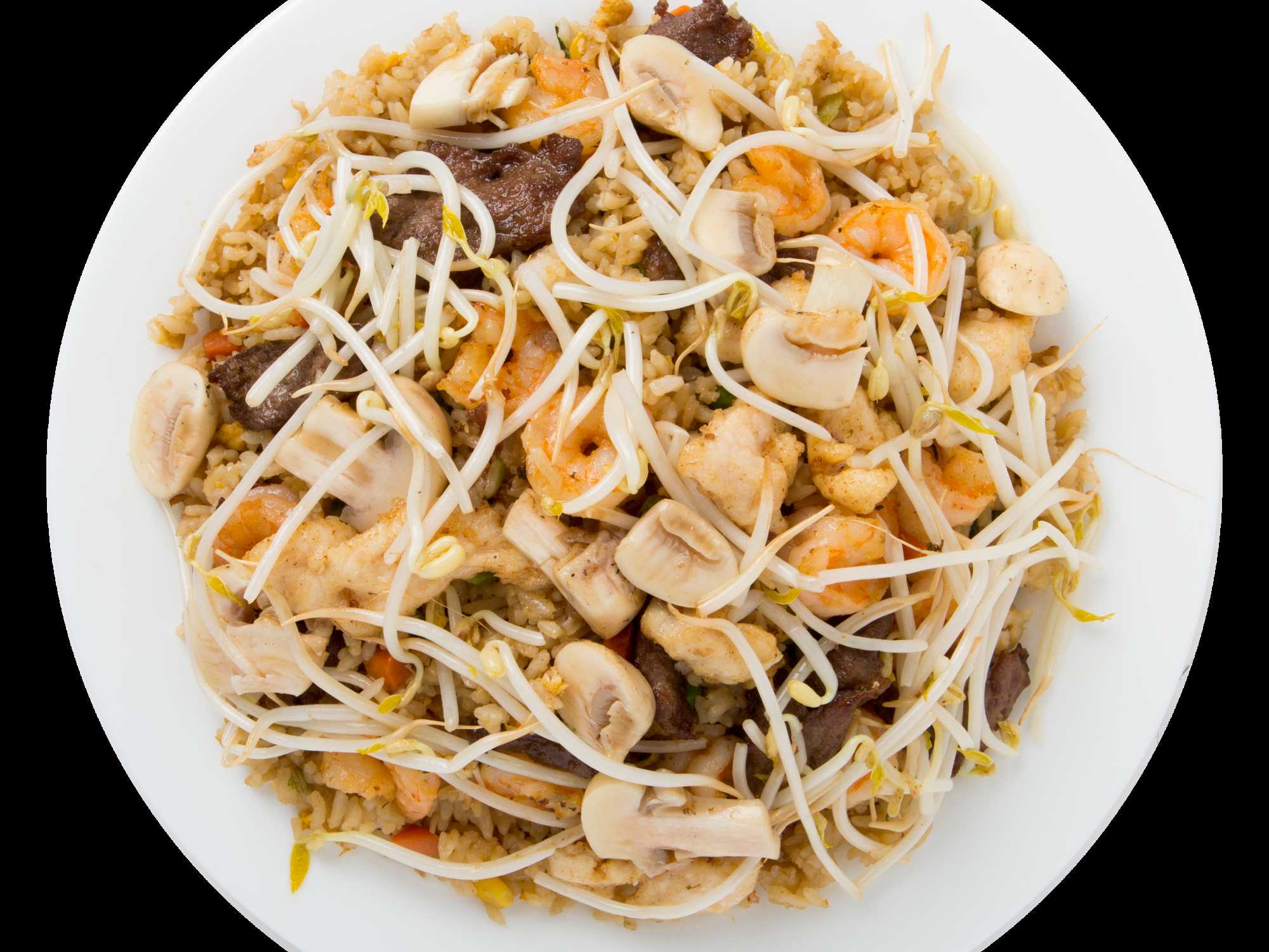 Pollo, camarón, res, champiñón, brócoli, zanahoria, pimiento, cebolla, hongo en salsa de mariscos (salsa oscura).