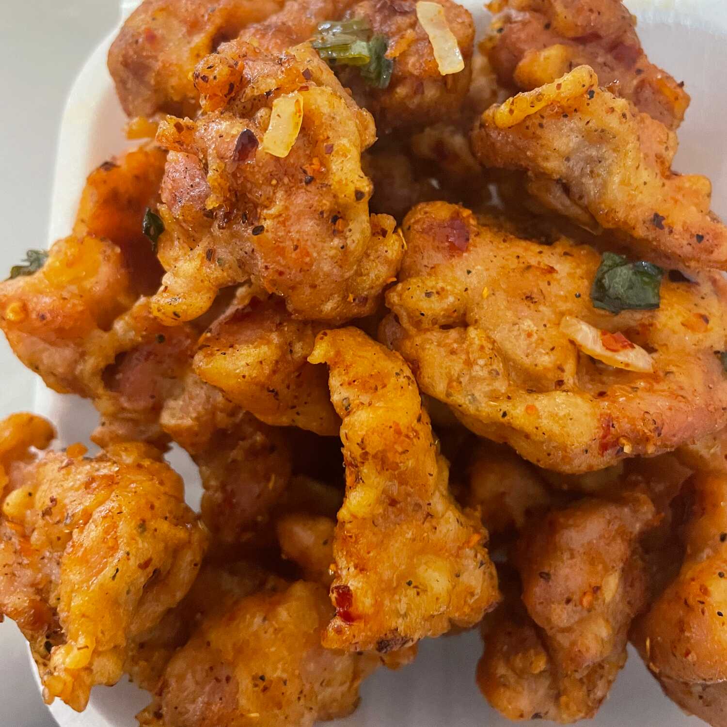 Pollo frito, empanizado sin hueso en salsa agridulce picante.
