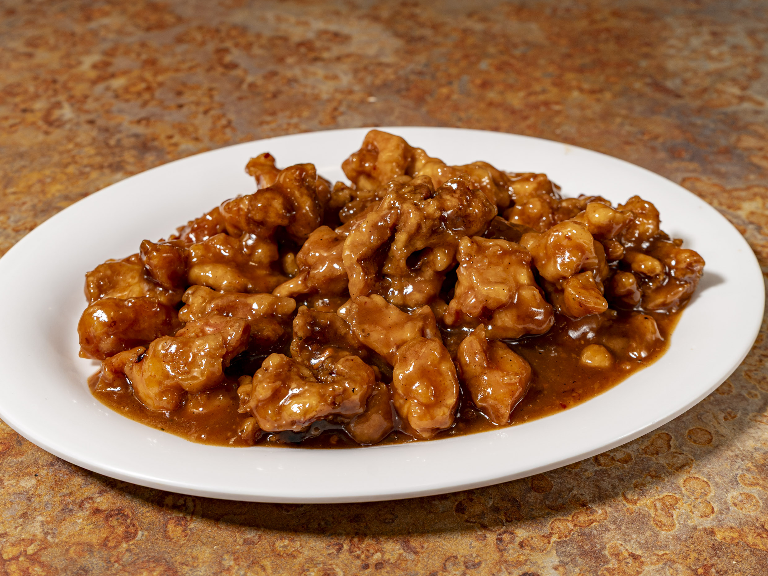 Res frita empanizada en salsa agridulce picante sabor a naranja.