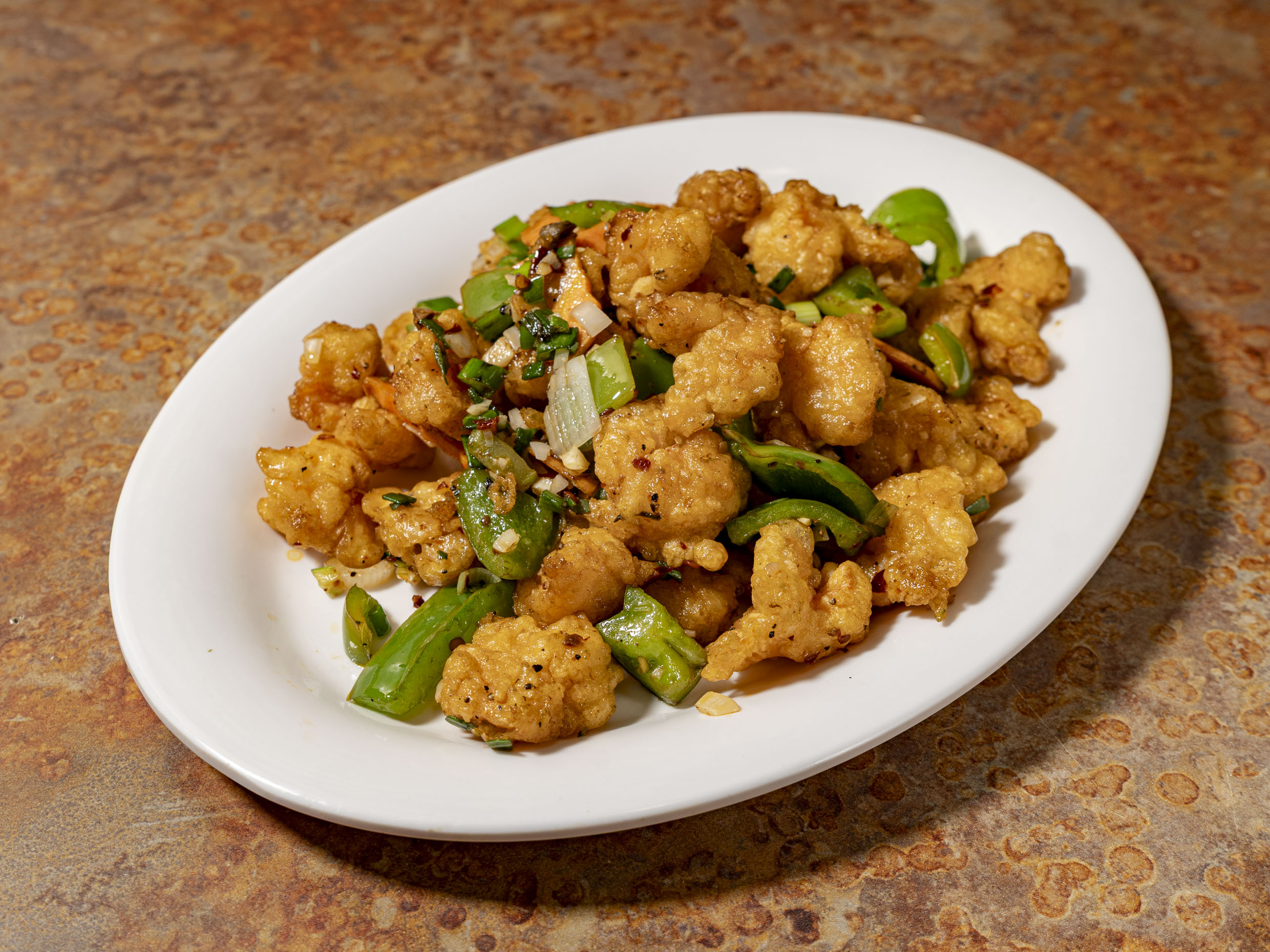 Camarón empanizado con Pimiento, Zanahoria, Cebollin y picante salteados y condimentados con nuestras especias orientales