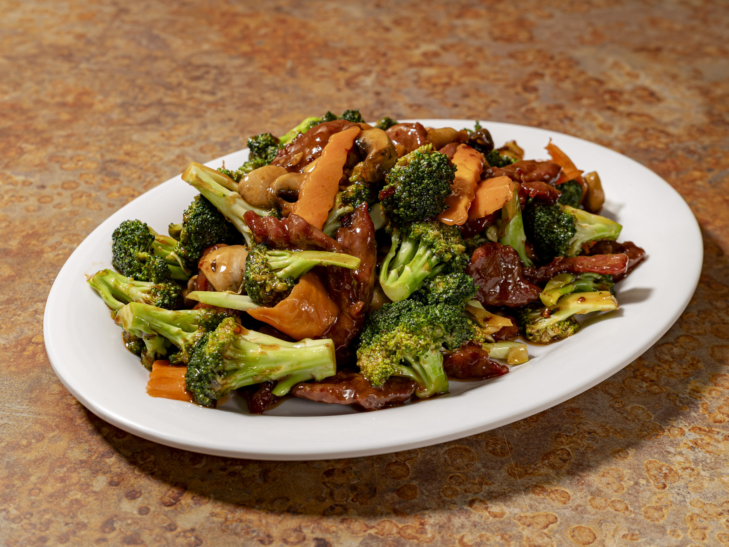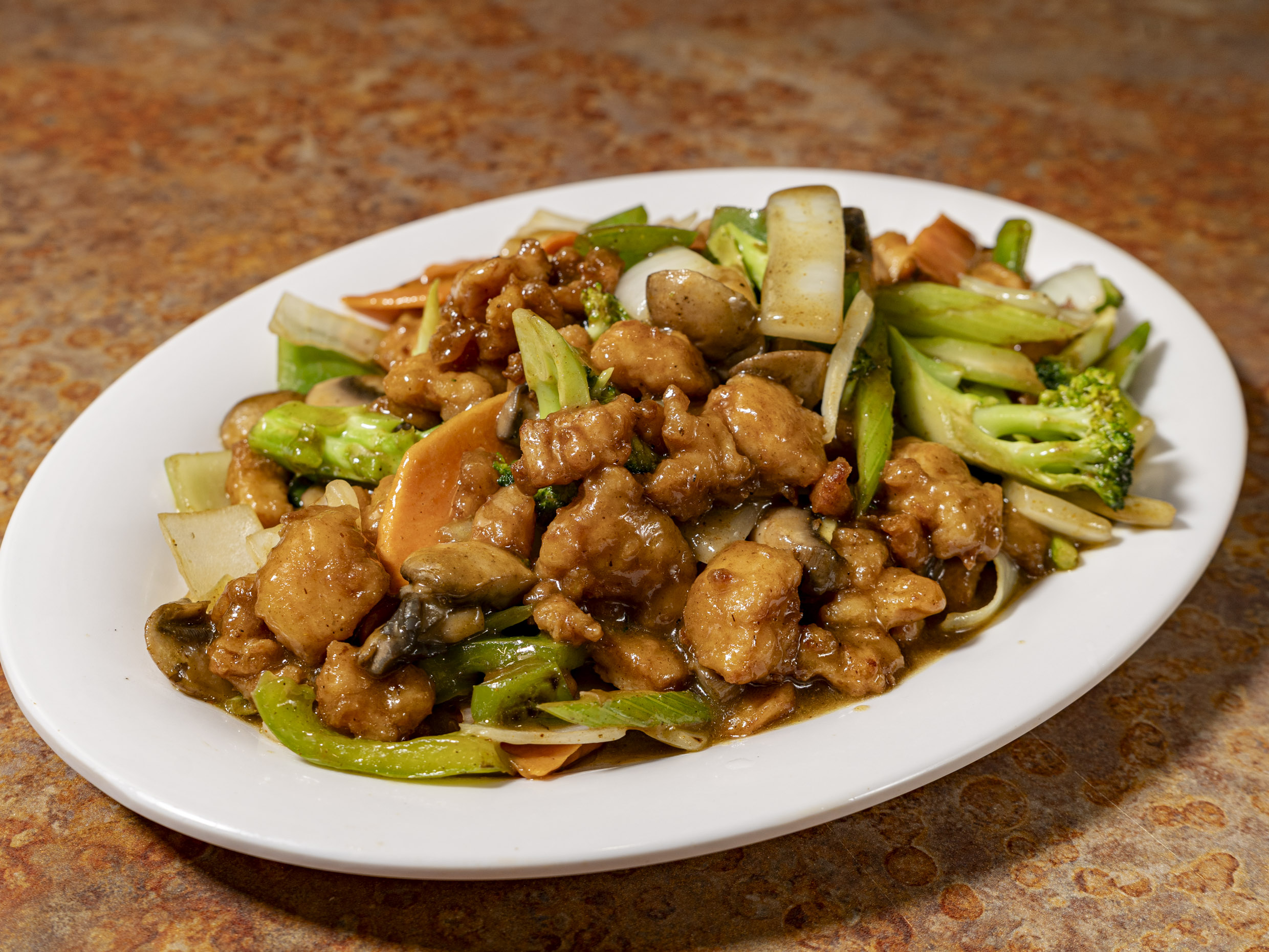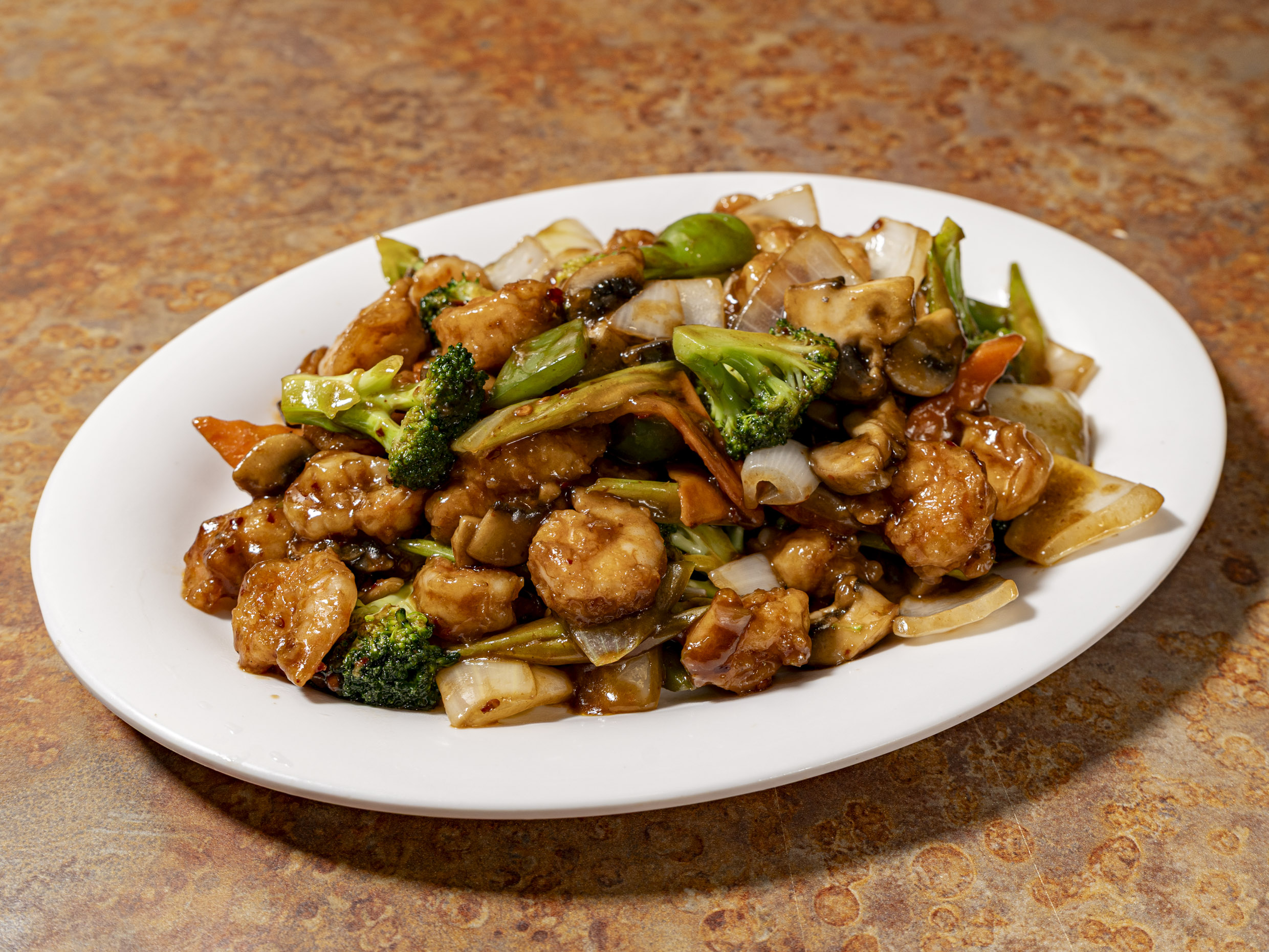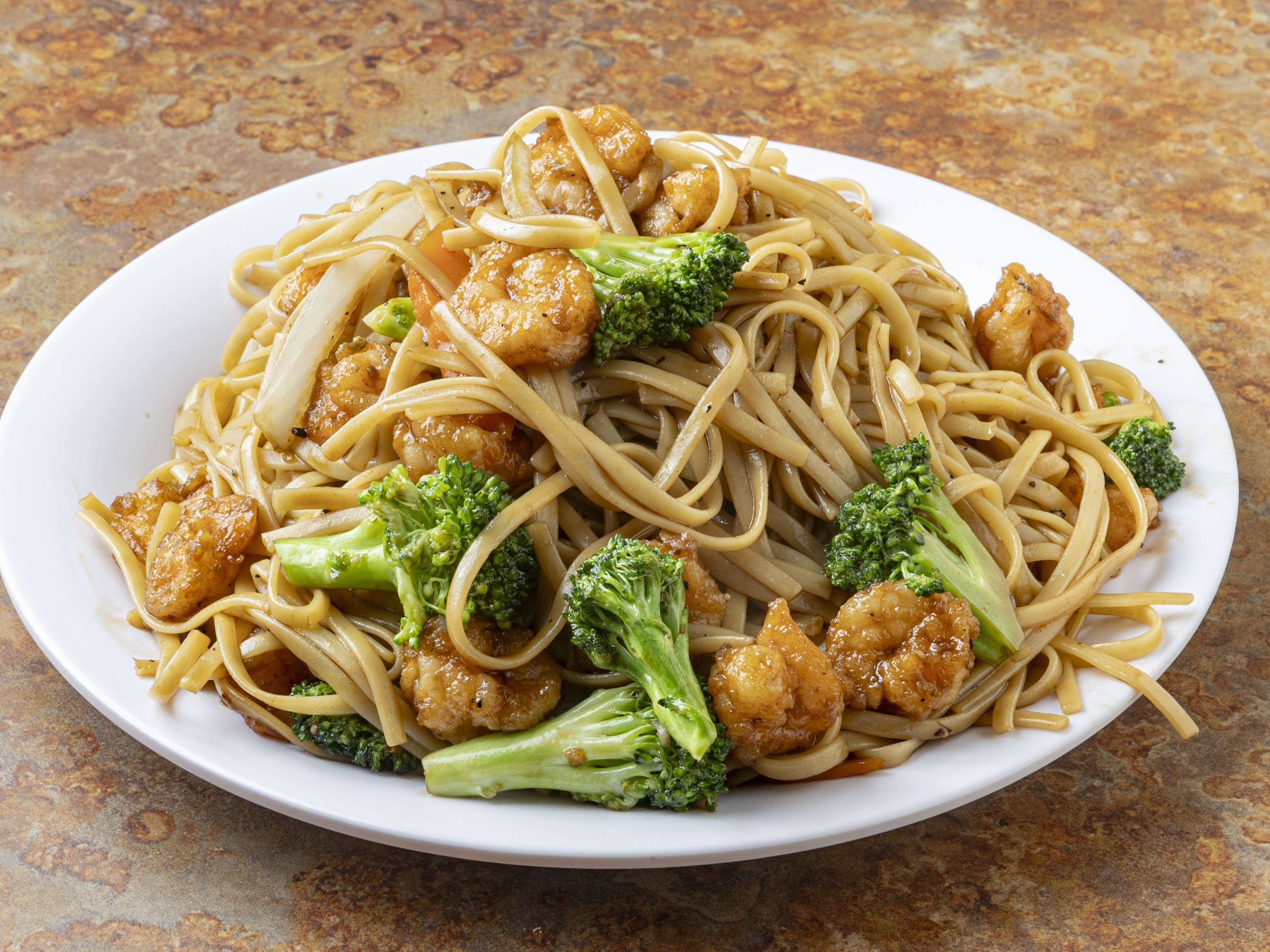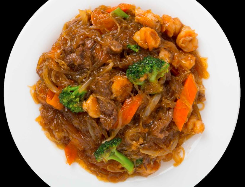 Camarón, Pollo y Res, Fensi (deo cristalizado) Brócoli, Cebolla Zanahoria en salsa oscura.