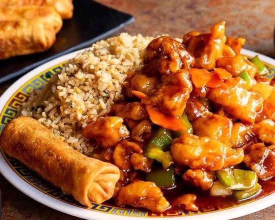 elige Guiso de pollo o res, arroz frito, un rollo. para una persona