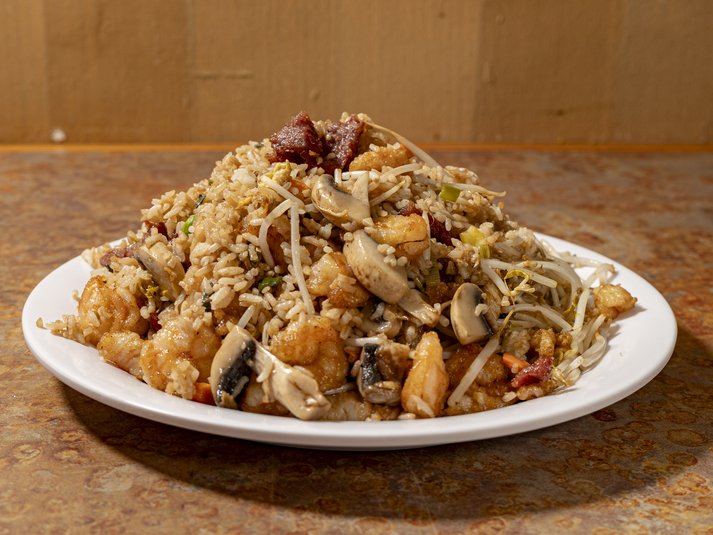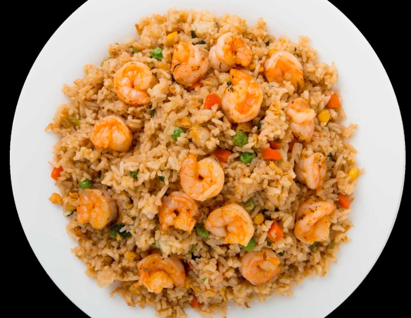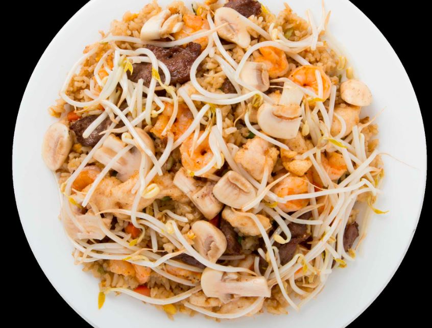 Arroz frito con zanahoria, elote, chícharo y cebollín, camarón, pollo, res, germen de soya, champiñones.