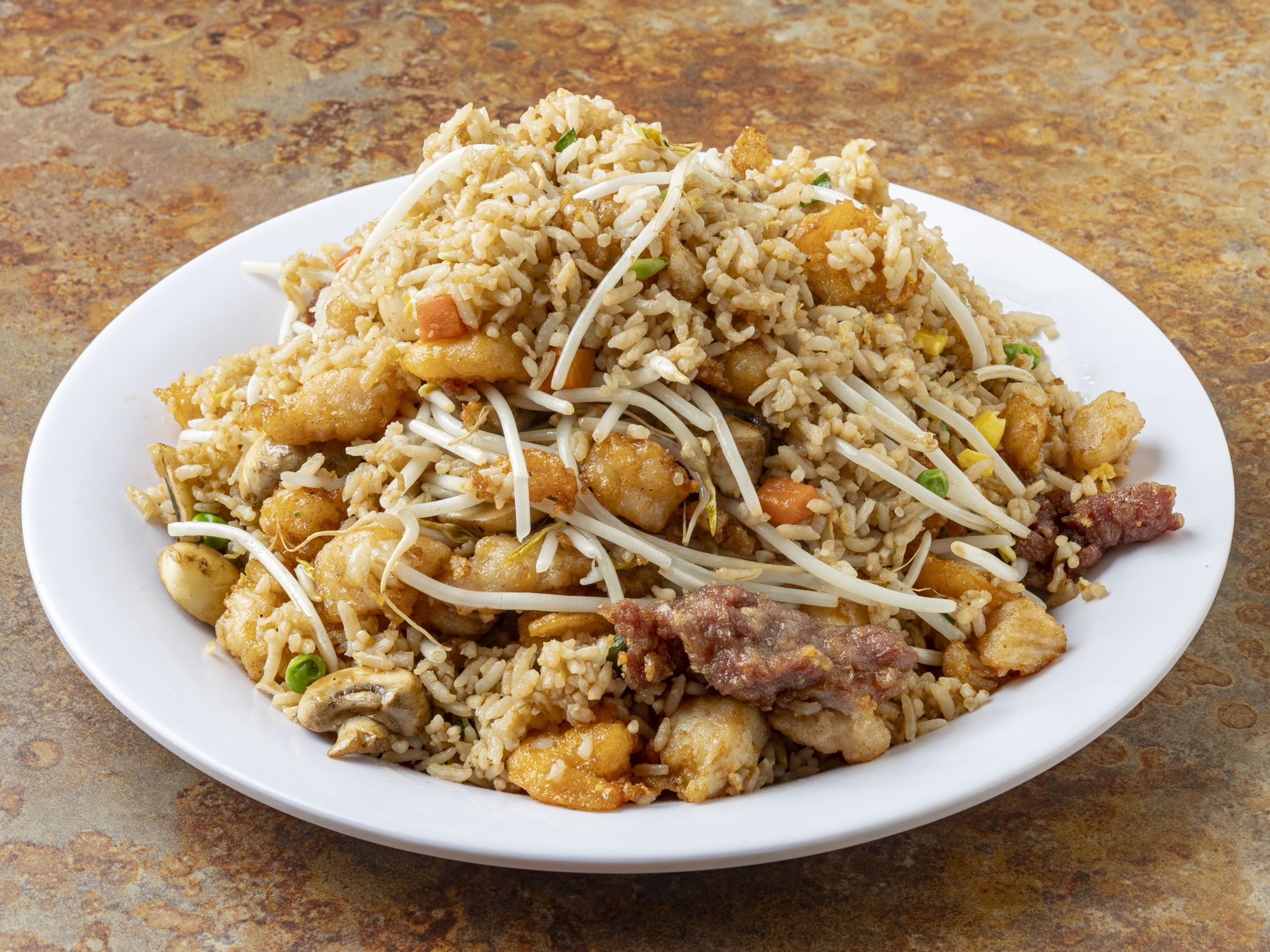 Arroz frito con zanahoria, elote, chícharo y cebollín, camarón, pollo y res.