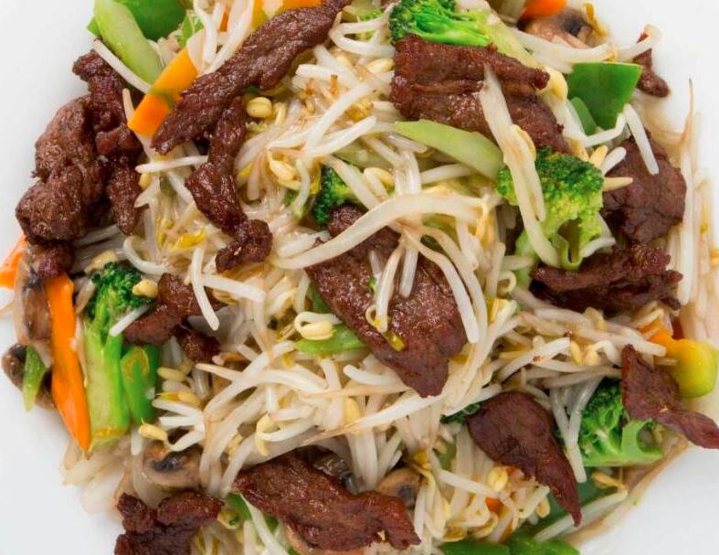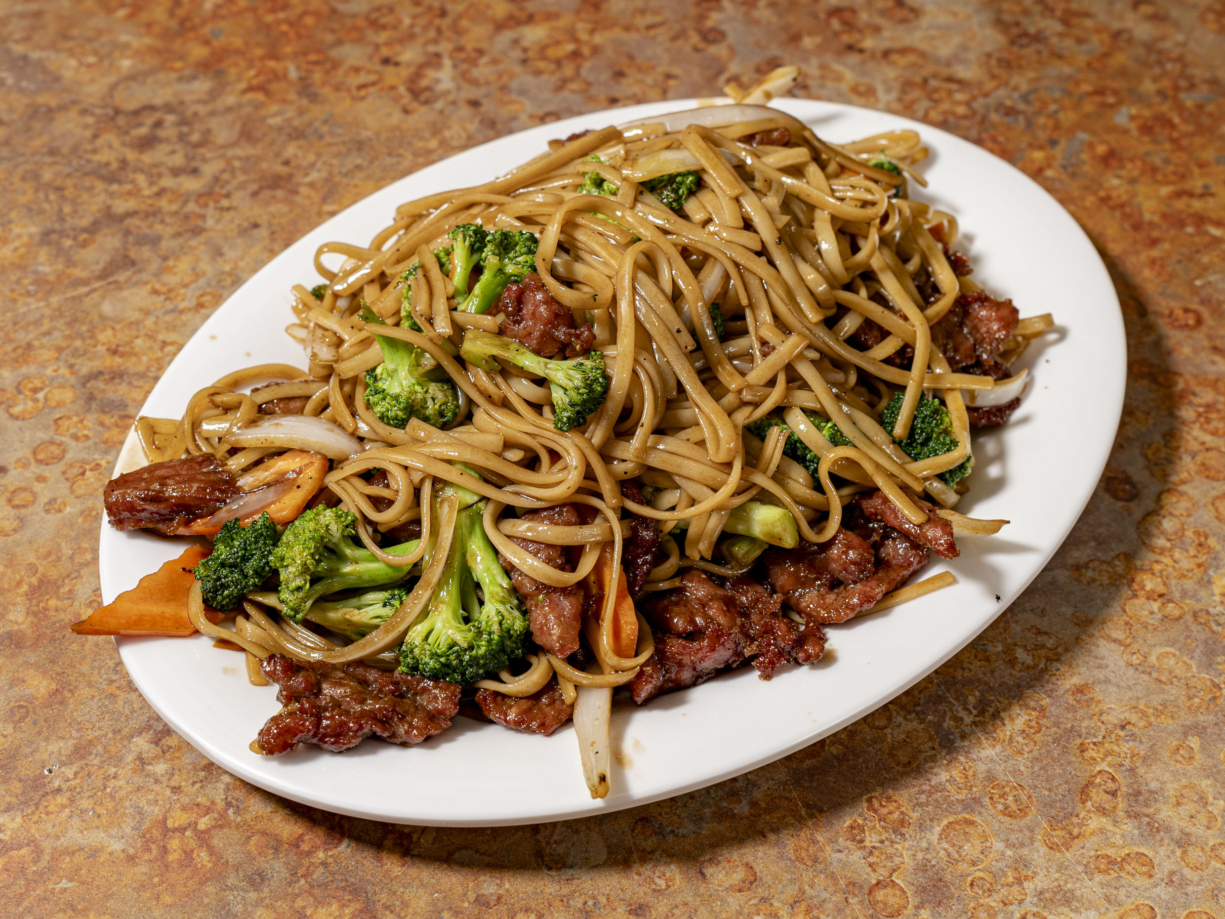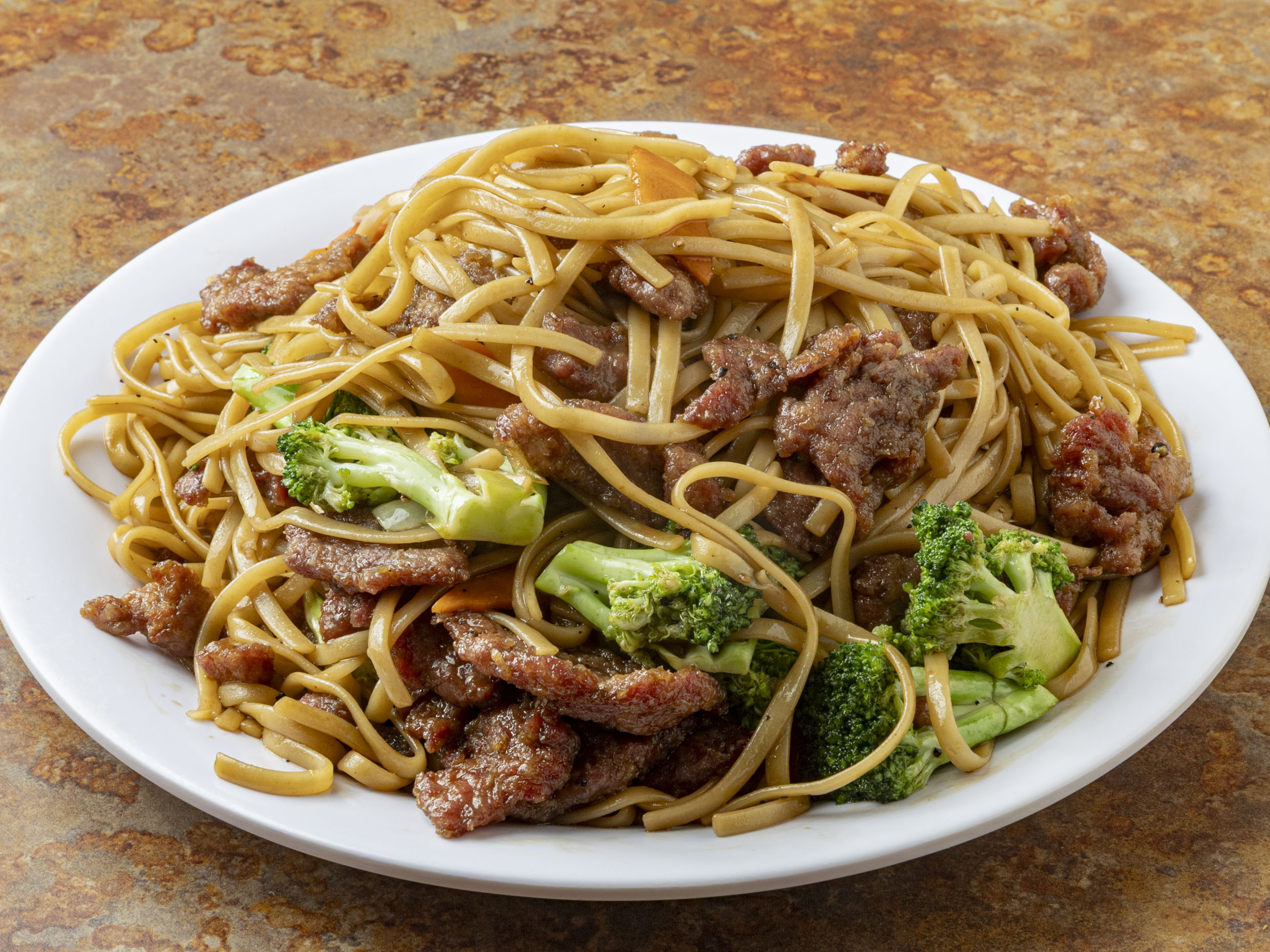 Brócoli, zanahoria, cebolla, res y tallarines en salsa oscura.