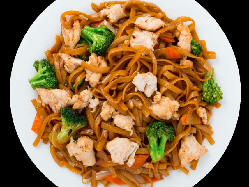 Brócoli, zanahoria, cebolla, pollo y tallarines en salsa oscura.