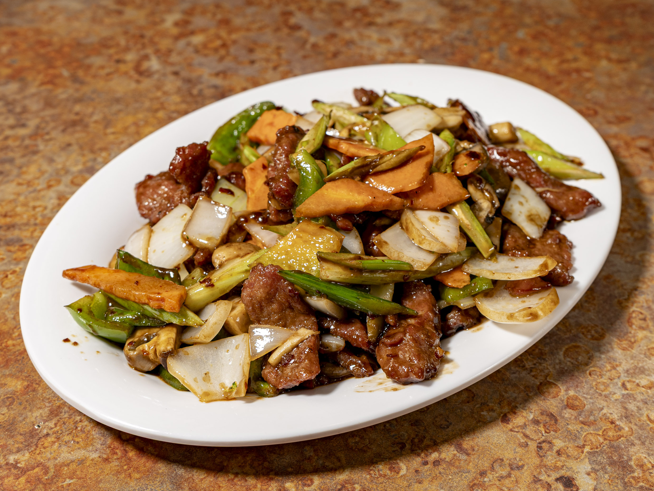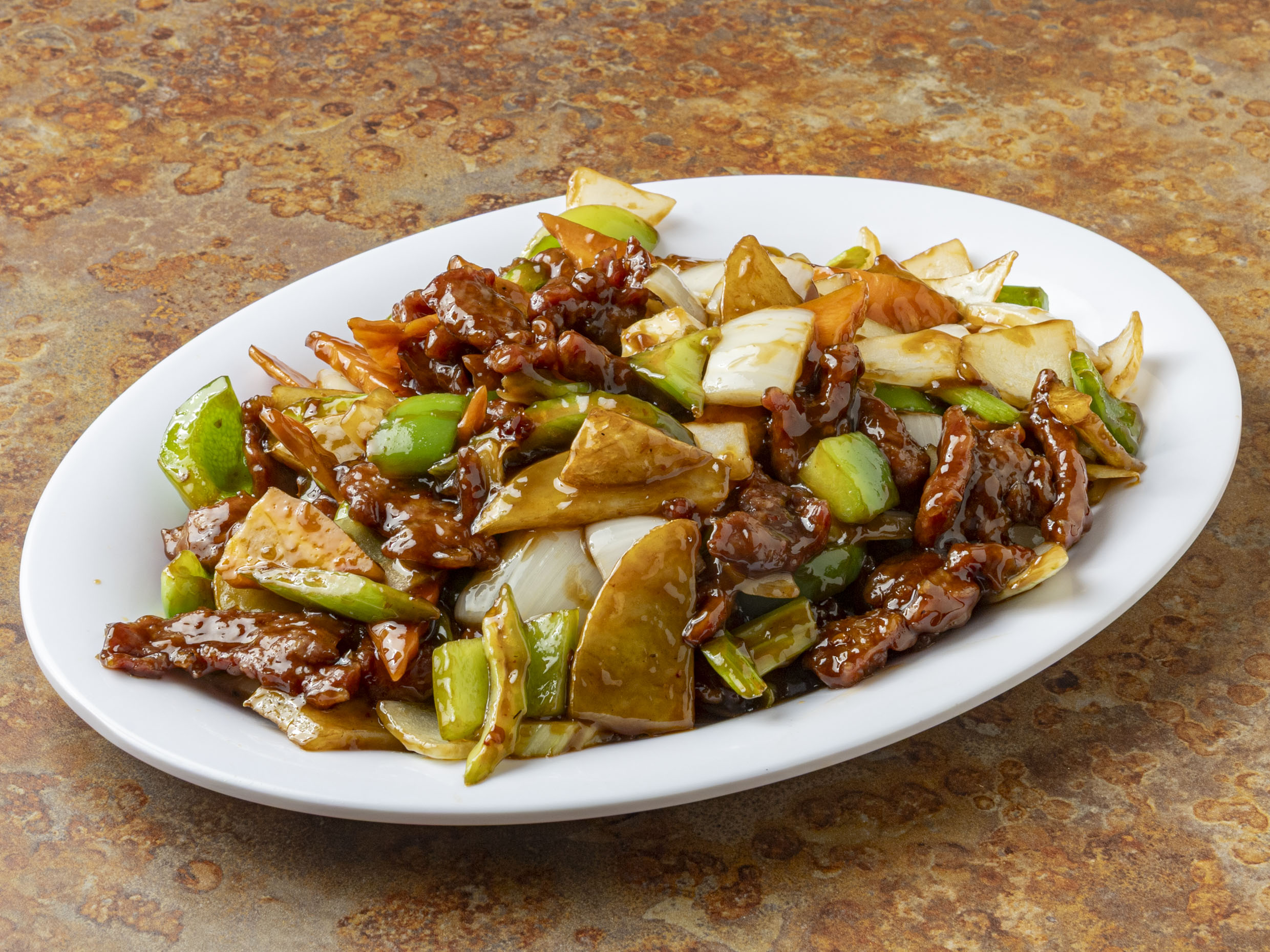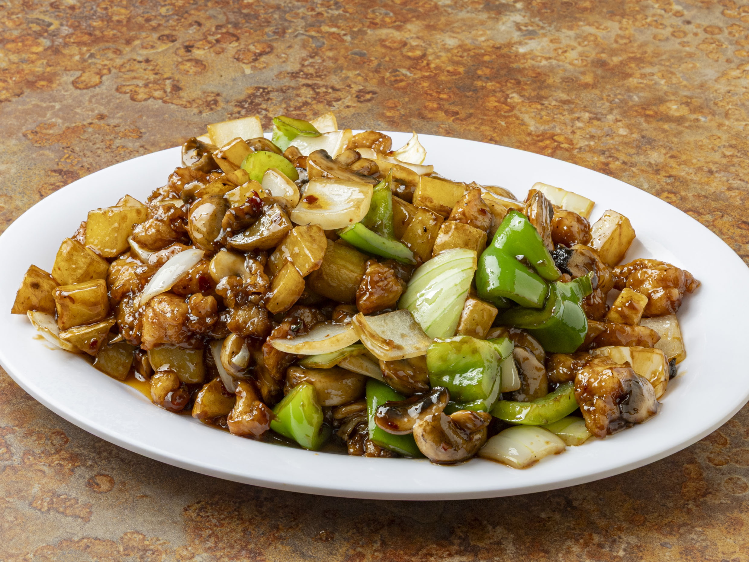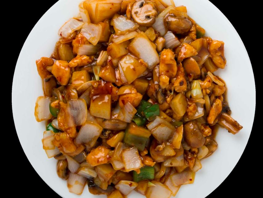Cebolla, pimiento, champiñon, zanahoria, papa y chile cambray en salsa oscura picante. (Imagen ilustrativa)