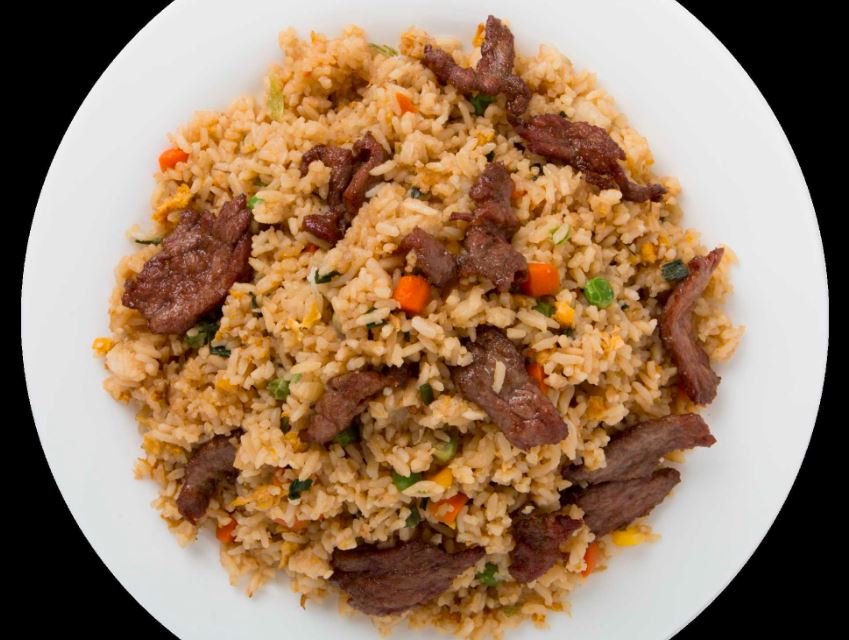 Media porción de arroz frito con trocitos de res.